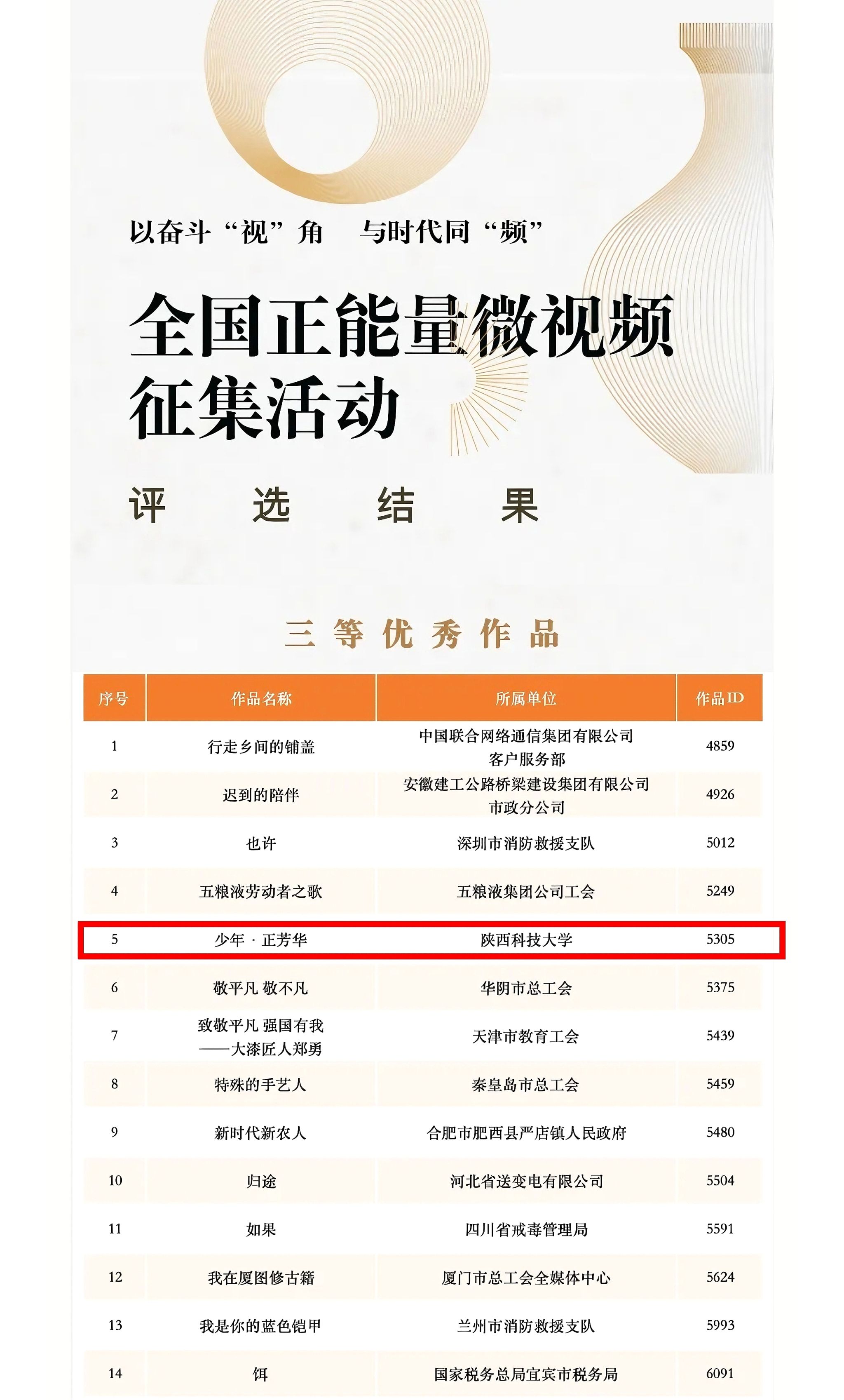 此前,在2024年“網(wǎng)聚職工正能量 爭(zhēng)做陜西好網(wǎng)民”正能量作品主題活動(dòng)中,我校就有多部作品獲得省級(jí)獎(jiǎng)項(xiàng):網(wǎng)絡(luò)正能量微視頻一等優(yōu)秀作品《你好,青年》、二等優(yōu)秀作品《少年·正芳華》,優(yōu)秀網(wǎng)評(píng)文章一等優(yōu)秀作品《心懷“國(guó)之大者”,做上好思政課的“大先生”》等。