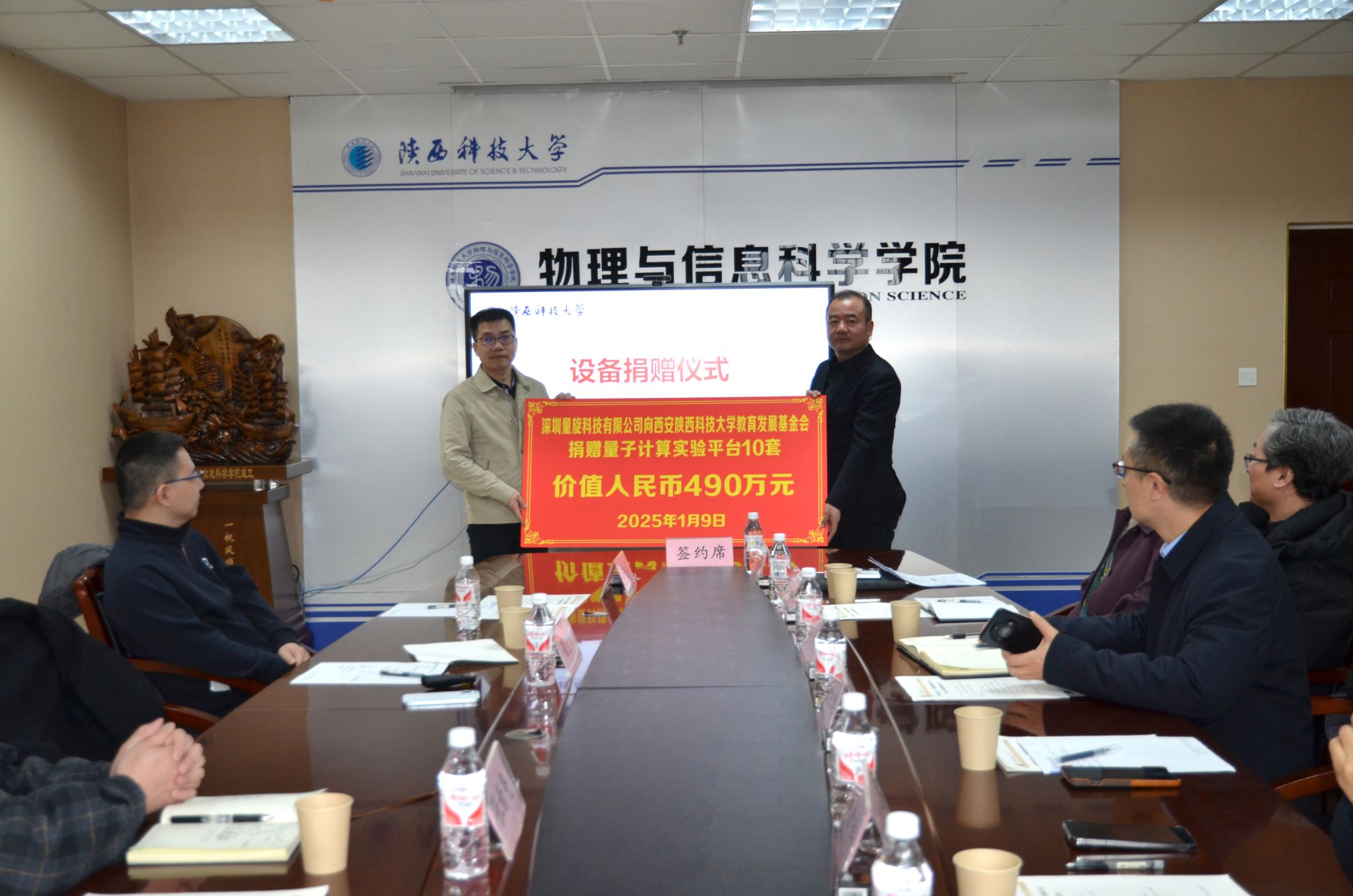 1月9日,陜西科技大學(xué)與深圳量旋科技有限公司產(chǎn)學(xué)研合作簽約暨捐贈(zèng)儀式在物理學(xué)院舉行。深圳量旋科技有限公司總裁項(xiàng)金根、副總裁鄒宏洋、區(qū)域銷(xiāo)售總監(jiān)張新堯,陜西科技大學(xué)副校長(zhǎng)費(fèi)貴強(qiáng)、教育發(fā)展基金會(huì)理事長(zhǎng)殷立雄、實(shí)驗(yàn)室與設(shè)備管理處處長(zhǎng)代春吉以及物理學(xué)院班子成員、師生代表參加儀式。深圳量旋科技有限公司向陜西科技大學(xué)捐贈(zèng)價(jià)值490萬(wàn)元人民幣的量子計(jì)算實(shí)驗(yàn)平臺(tái)10套。物理學(xué)院黨委書(shū)記陳源梅主持簽約儀式。