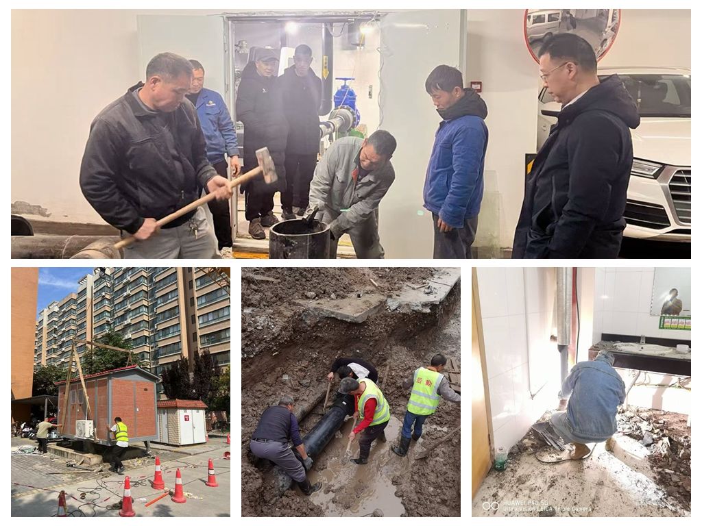 2025年1月27日,家屬區(qū)自來水主管網(wǎng)突發(fā)爆裂,后勤團(tuán)隊(duì)連夜集結(jié),多方聯(lián)系協(xié)調(diào),與西安市自來水公司協(xié)同作戰(zhàn)26小時(shí),克服配件短缺、施工復(fù)雜等難題,在嚴(yán)寒中完成搶修任務(wù),恢復(fù)供水。