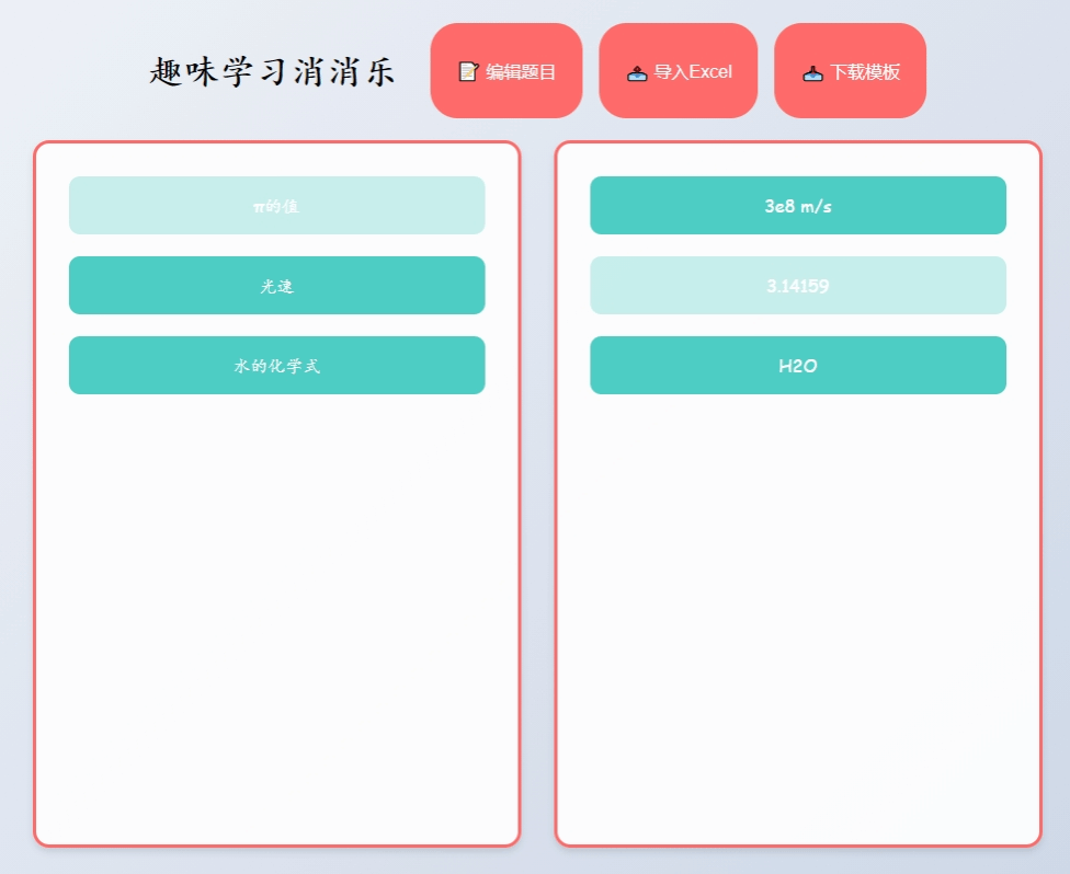 “趣味消消樂(lè)”提示詞:幫我制作一個(gè)針對(duì)學(xué)習(xí)的連連看游戲網(wǎng)頁(yè),淺色背景。分左右兩列,左邊一列為問(wèn)題,右邊一列為答案,左右選擇正確后消除,且左邊問(wèn)題和右邊答案亂序排列。問(wèn)題和答案提供一個(gè)可編輯頁(yè)面供老師編輯問(wèn)題和答案。同時(shí),也提供下載的excel模板,有導(dǎo)入excel按鈕功能。
