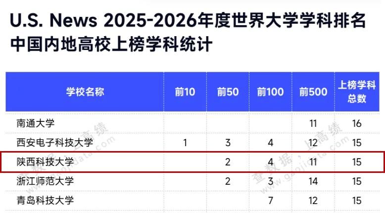 6月17日,U.S.News發(fā)布了世界大學(xué)學(xué)科排行榜,陜西科技大學(xué)共有15個(gè)學(xué)科上榜,較上期新增2個(gè)上榜學(xué)科,分別為電氣與電子工程、環(huán)境科學(xué)與生態(tài)學(xué)。本期有2個(gè)學(xué)科進(jìn)入全球前50:高分子科學(xué)排名第39位,較上期前進(jìn)10位;食品科學(xué)技術(shù)排名第48位。我校上榜學(xué)科數(shù)位居陜西省屬高校前列,是陜西省屬高校中唯一擁有進(jìn)入全球前50學(xué)科的學(xué)校。