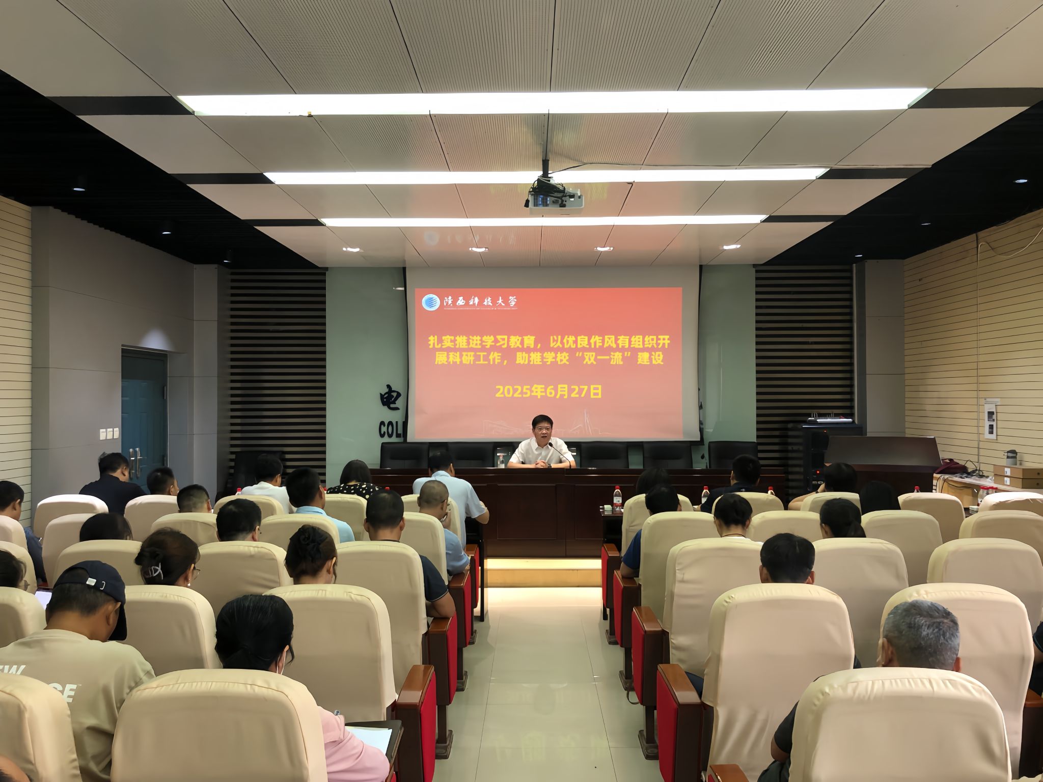 為持續(xù)深化深入貫徹中央八項規(guī)定精神學習教育成效,6月27日,黨委委員、副校長陸趙情以《扎實推進學習教育,以優(yōu)良作風有組織開展科研工作,助推學?!半p一流”建設》為題,為分管聯(lián)系單位黨員干部講授作風建設專題黨課。