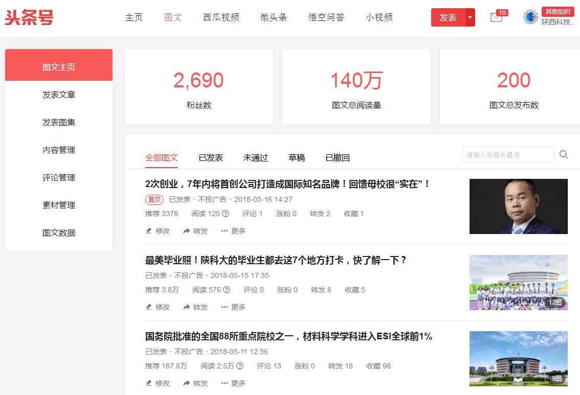 自2017年5月“陜西科技大學(xué)招生辦”頭條號開通以來,教育部頭條號“微言教育”聯(lián)合“今日頭條”官方對全國千余所高校累計評選的10期榜單中,招生辦頭條號在全國高校排名中屢創(chuàng)新高,社會關(guān)注度不斷提升,累計6次進(jìn)入全國榜單前十五,8次進(jìn)入全國同類型賬號前三名,5次獲得全國同類型賬號第一,6次獲得陜西同類型賬號第一。今年3、4月,分別列全國高校第8位和第5位,全國高校同類型賬號冠、亞軍,持續(xù)刷新榜單記錄。