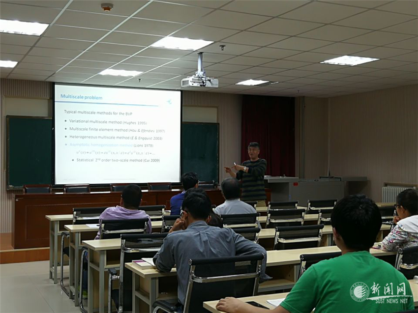 聶玉峰教授簡要介紹了數(shù)值計(jì)算中多尺度分析方法的主要思想,闡述了均勻化方法的精度依賴于代表體積元的尺寸和模型邊界條件,而且當(dāng)材料組分的性能參數(shù)相差懸殊時(shí),Dirichlet邊界條件和Neumann邊界條件提供的預(yù)測(cè)范圍太大,但他們創(chuàng)造性的采用Robin邊界條件,證明了計(jì)算方法的收斂性,數(shù)值結(jié)果表明它有良好的性能。聶教授給廣大師生帶來了偏微分方程數(shù)學(xué)理論在應(yīng)用領(lǐng)域最前沿和最熱點(diǎn)問題,他和與會(huì)師生進(jìn)行了交流,其嚴(yán)謹(jǐn)?shù)膶W(xué)術(shù)態(tài)度和精深的學(xué)術(shù)造詣,以及用易見的實(shí)例說明深刻學(xué)術(shù)理論的講述風(fēng)格受到全體師生的高度贊揚(yáng)。