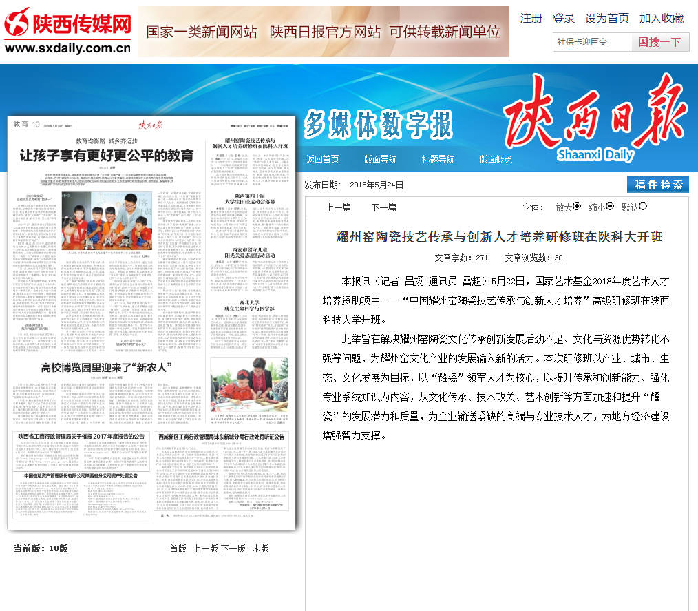 5月24日,《陜西日?qǐng)?bào)》教育版報(bào)道了我校舉辦耀州窯陶瓷技藝傳承與創(chuàng)新人才培養(yǎng)研修班活動(dòng)的新聞,全文轉(zhuǎn)載如下: