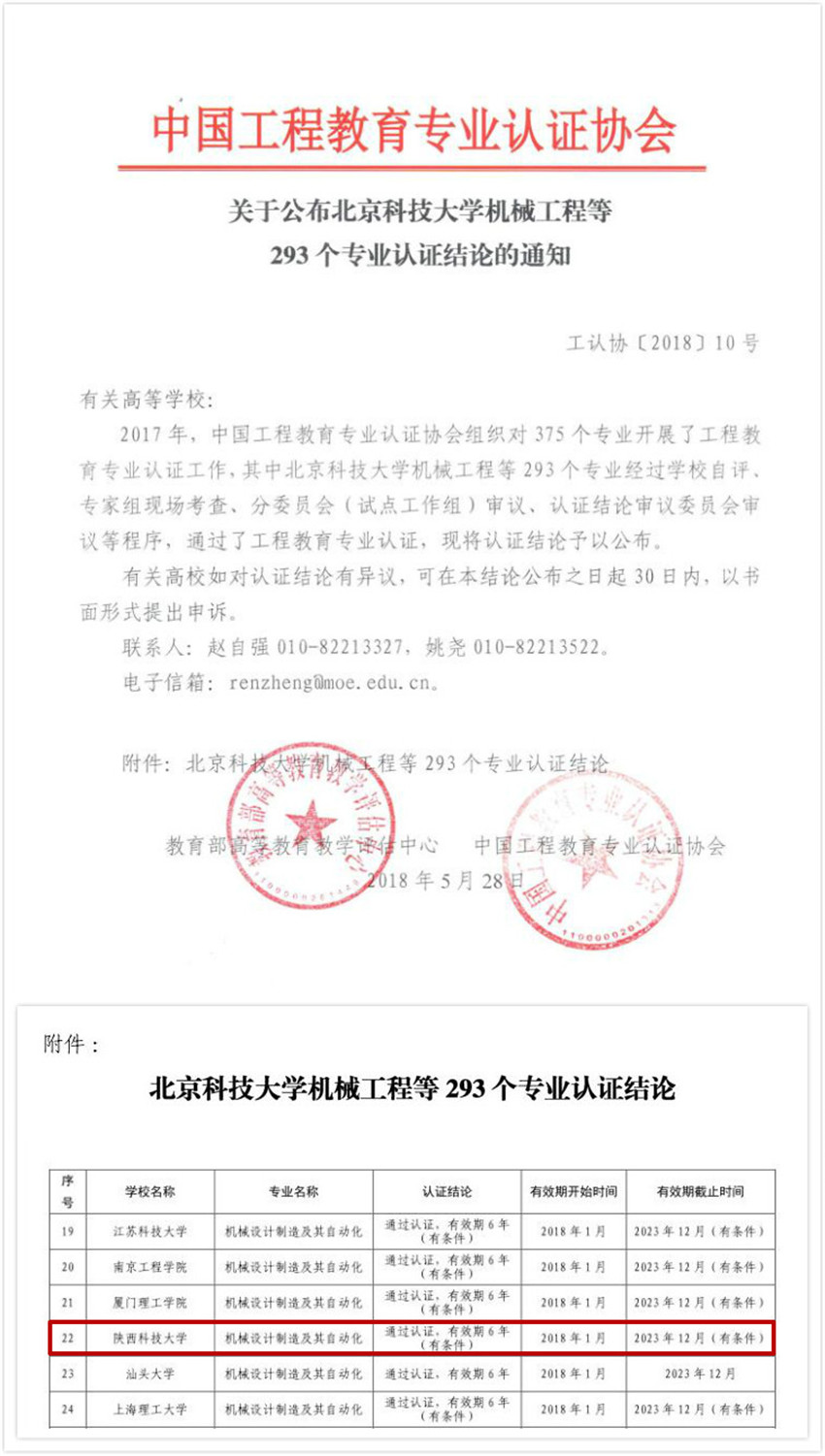 近日,教育部高等教育教學(xué)評估中心和中國工程教育專業(yè)認(rèn)證協(xié)會聯(lián)合發(fā)布了《關(guān)于公布北京科技大學(xué)機械工程等293個專業(yè)認(rèn)證結(jié)論的通知》(工認(rèn)協(xié)〔2018〕10號),公布了2017年參加全國工程教育專業(yè)認(rèn)證的認(rèn)證結(jié)論,經(jīng)過學(xué)校自評、專家組現(xiàn)場考查、分委員會(試點工作組)審議、認(rèn)證結(jié)論審議委員會審議等程序,全國高校共有293個專業(yè)通過認(rèn)證。我校機械設(shè)計制造及其自動化專業(yè)名列其中,順利通過中國工程教育專業(yè)認(rèn)證,有效期為6年(有條件),即2018年1月至2023年12月。此前,機械設(shè)計制造及其自動化專業(yè)于2017年11月6日至8日接受了工程教育專業(yè)認(rèn)證專家組現(xiàn)場考查。至此,我校已有包括無機非金屬材料工程、食品科學(xué)與工程、化學(xué)工程與工藝、機械設(shè)計制造及其自動化在內(nèi)的四個專業(yè)通過工程教育專業(yè)認(rèn)證。