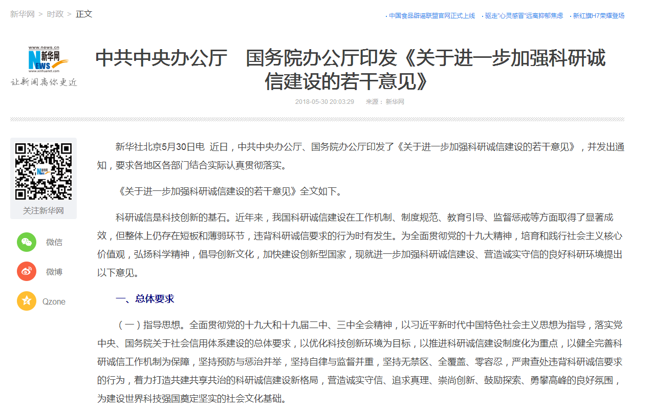近日,中共中央辦公廳、國務(wù)院辦公廳印發(fā)了《關(guān)于進(jìn)一步加強(qiáng)科研誠信建設(shè)的若干意見》,并發(fā)出通知,要求各地區(qū)各部門結(jié)合實(shí)際認(rèn)真貫徹落實(shí)。全文轉(zhuǎn)載如下: