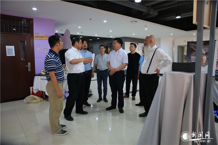 王宏兵一行在校紀(jì)委書記、設(shè)計學(xué)學(xué)術(shù)帶頭人王樹茂教授的陪同下,參觀了設(shè)藝學(xué)院畢業(yè)設(shè)計展,并同產(chǎn)品設(shè)計、工業(yè)設(shè)計、視覺傳達設(shè)計、動畫、環(huán)境藝術(shù)等教研室主任和策展負責(zé)人老師進行了深入交流。王宏兵指出,咸陽市和陜西科技大學(xué)設(shè)計與藝術(shù)學(xué)院在文化創(chuàng)意產(chǎn)品、旅游紀(jì)念品、傳統(tǒng)文化的視覺化展示、景區(qū)內(nèi)容建設(shè)、媒體內(nèi)容建設(shè)等方面具有很大的合作空間,市文廣新局、市旅游局等相關(guān)部門要盡快就具體合作事宜進行對接。