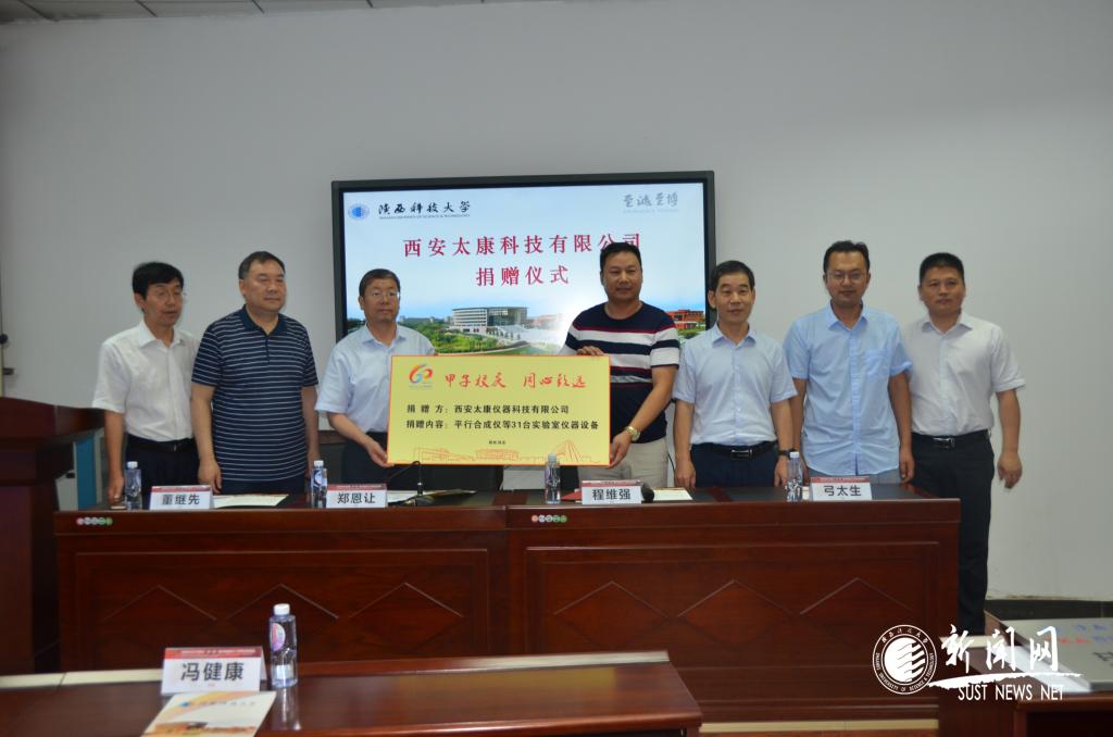 6月25日上午,著名的實(shí)驗(yàn)室反應(yīng)釜研發(fā)、生產(chǎn)、銷售企業(yè),我校實(shí)驗(yàn)室建設(shè)合作伙伴西安太康科技有限公司為助推學(xué)校發(fā)展,并祝賀我校60周年校慶,特向我校捐贈(zèng)一批價(jià)值30余萬(wàn)元的實(shí)驗(yàn)室設(shè)備,并在此基礎(chǔ)上創(chuàng)建陜西科技大學(xué)與西安太康科技有限公司共建實(shí)驗(yàn)室。參加本次捐贈(zèng)儀式的有西安太康科技有限公司總經(jīng)理程維強(qiáng)、主任馮健康,校長(zhǎng)助理鄭恩讓、校友總會(huì)顧問董繼先、輕工科學(xué)與工程學(xué)院院長(zhǎng)弓太生、副院長(zhǎng)呂斌等。實(shí)驗(yàn)室與設(shè)備管理處副處長(zhǎng)張海寧主持了捐贈(zèng)儀式。