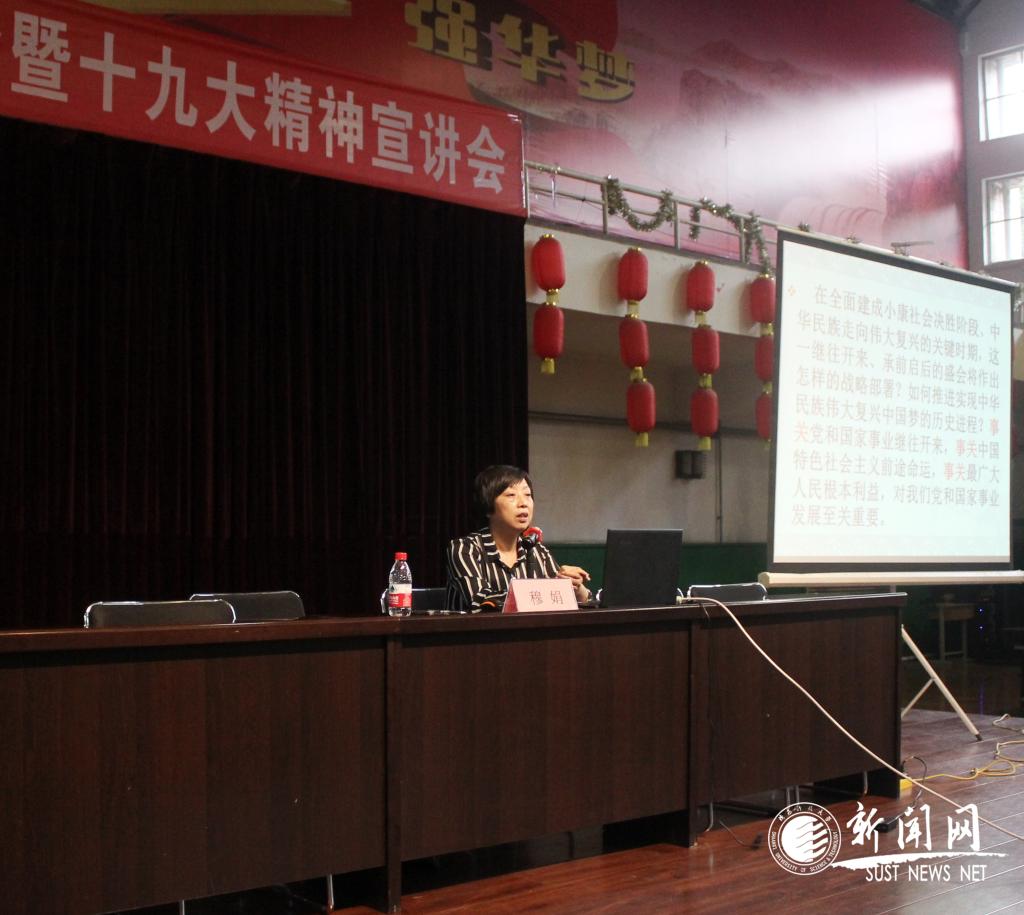 在表彰儀式后,咸陽(yáng)市黨的十九大精神專(zhuān)家宣講團(tuán)成員,陜西省黨校系統(tǒng)優(yōu)秀教師,中共咸陽(yáng)市委黨校黨史黨建教研室主任穆娟教授為全體黨員干部教師作了題為“面向新時(shí)代的政治宣言和行動(dòng)綱領(lǐng)——學(xué)習(xí)領(lǐng)會(huì)黨的十九大精神”的專(zhuān)題宣講報(bào)告。穆娟教授緊扣黨的十九大報(bào)告,從充分認(rèn)識(shí)黨的十九大的重大意義、全面準(zhǔn)確學(xué)習(xí)領(lǐng)會(huì)黨的十九大精神、以高度政治自覺(jué)貫徹落實(shí)好十九大精神三個(gè)大的方面對(duì)黨的十九大精神進(jìn)行了的解讀。