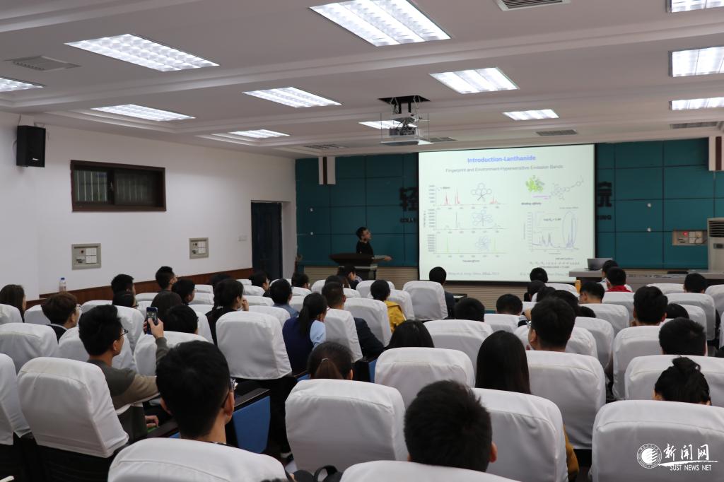 黃嘉良教授報(bào)告的題目是“鑭系配合物在腫瘤影像學(xué)及腫瘤抑制中的應(yīng)用”。順鉑(鉑金屬配合物)作為一種經(jīng)典的抗癌藥物,難以選擇性地對(duì)腫瘤進(jìn)行抑制,其毒性也會(huì)對(duì)正常的身體組織造成傷害,由此帶來(lái)極大的副作用,往往被人詬病。黃嘉良教授團(tuán)隊(duì)利用釕配合物更小的毒性以及更高的可操作性,提出以釕代替鉑設(shè)計(jì)低副作用抗癌藥物的理念,并通過(guò)前體藥物的組裝,進(jìn)一步提高了這種新型抗癌藥物的可控性與安全性。與此同時(shí),銪作為鑭系元素的一員,具有高辨識(shí)度的可見(jiàn)光發(fā)射峰,該配合物被認(rèn)為是一種極具潛力的光信號(hào)產(chǎn)生器。將銪與釕的兩種配合物進(jìn)行組合,可控的藥物釋放與即時(shí)的定位檢測(cè)在特定化合物中成為了現(xiàn)實(shí),充分地迎合了藥物開(kāi)發(fā)中對(duì)于復(fù)合功能性的要求。黃嘉良教授的報(bào)告使現(xiàn)場(chǎng)師生對(duì)鑭系配合物的功能和在腫瘤抑制中的應(yīng)用有了很好的了解,開(kāi)闊了大家的眼界,對(duì)今后研究方向的拓展有很好的啟發(fā)性。報(bào)告最后,黃嘉良教授就大家的提問(wèn)進(jìn)行了耐心詳盡的解答。
