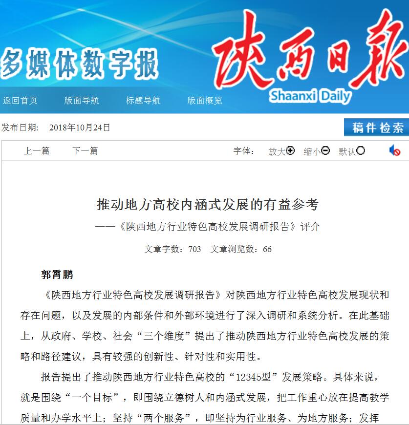 《陜西日?qǐng)?bào)》2018年10月24日“理論專版”刊發(fā)我校郭霄鵬教授團(tuán)隊(duì)獲獎(jiǎng)成果評(píng)介,題為“推動(dòng)地方高校內(nèi)涵式發(fā)展的有益參考——《陜西地方行業(yè)特色高校發(fā)展調(diào)研報(bào)告》評(píng)介”。該成果獲得陜西省第十三次哲學(xué)社會(huì)科學(xué)優(yōu)秀成果獎(jiǎng)一等獎(jiǎng)。