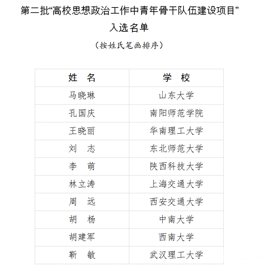 近日,教育部公示了“高校思想政治工作中青年骨干隊(duì)伍建設(shè)項(xiàng)目”遴選結(jié)果,我校學(xué)工部副部長(zhǎng)李萌名列其中。此次公布的前兩批入選者全國(guó)共計(jì)20人。