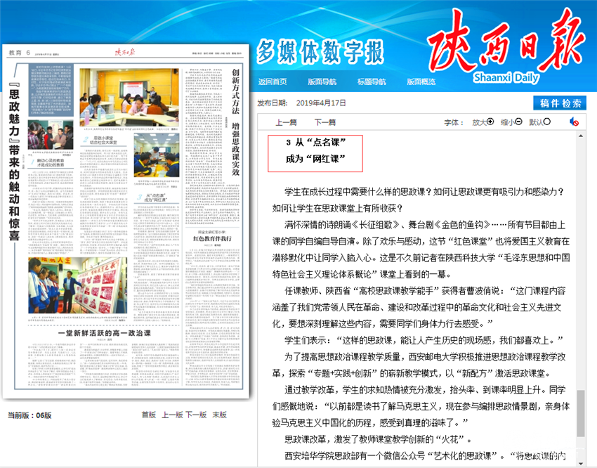 2019年4月17日,《陜西日報》教育版以《“思政魅力”帶來的觸動和驚喜》為題,報道全省思政課改革創(chuàng)新成果。文中,從“點名課”成為“網(wǎng)紅課”部分報道了我校思政課堂教學改革創(chuàng)新的成效。