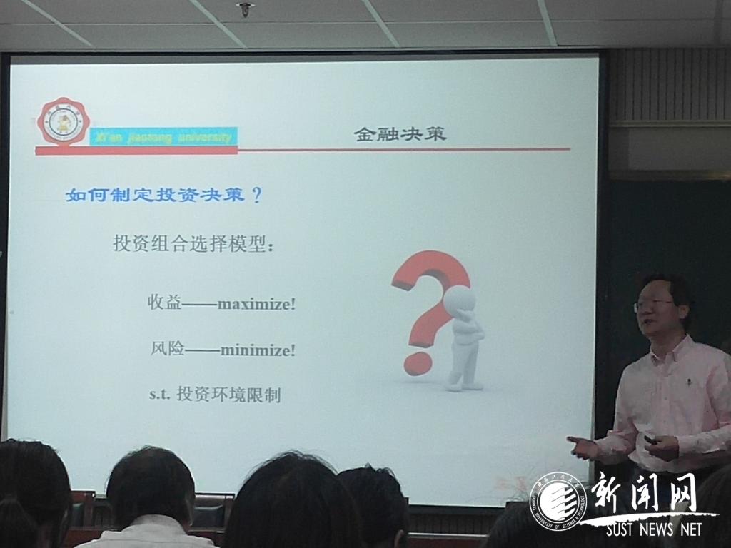 陳教授從數(shù)理金融概論、金融信息處理、金融決策和科研興趣與理論四個方面介紹了報告的內(nèi)容。陳教授利用數(shù)學(xué)工具研究金融問題,進(jìn)行數(shù)學(xué)建模和理論分析,對收集到的大量金融數(shù)據(jù)發(fā)現(xiàn)規(guī)律、進(jìn)行預(yù)測和制定投資決策。在數(shù)學(xué)上給出了穩(wěn)定分布的特征函數(shù),構(gòu)造了具有非線性非對稱的收益預(yù)測函數(shù),考慮收益受何種因素的影響及其多個證券收益間的關(guān)系,建立了風(fēng)險最小收益最大情況下的投資組合選擇模型,闡述現(xiàn)代數(shù)學(xué)與計算技術(shù)在金融領(lǐng)域中的應(yīng)用。