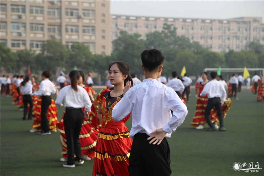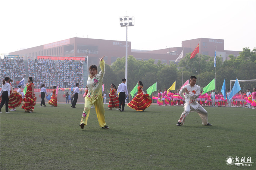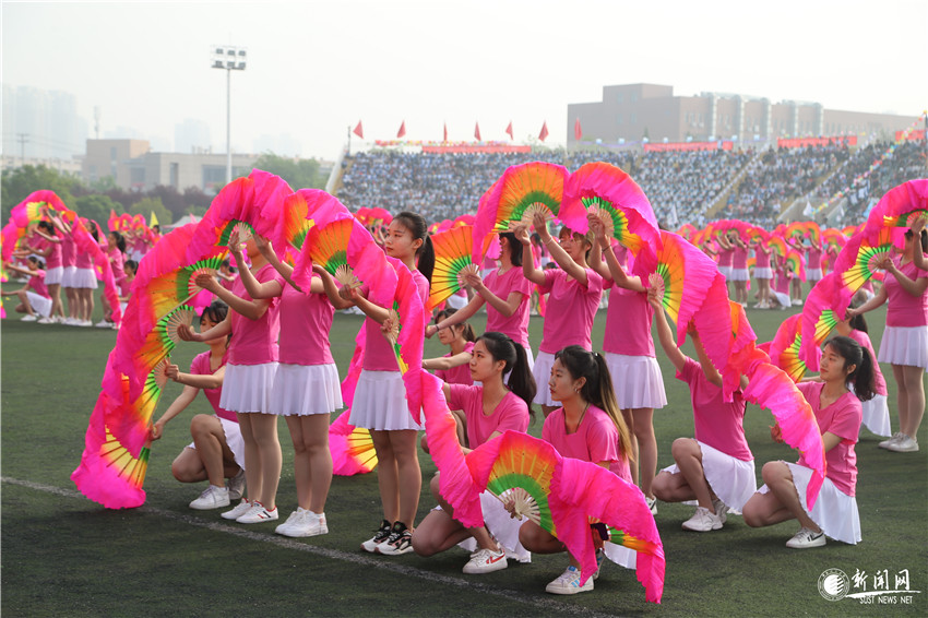 大學(xué)生團(tuán)體表演的體育舞蹈《我和我的祖國(guó)》、扇子舞《今天是你的生日,我的祖國(guó)》氣勢(shì)磅礴、韻味十足,近千名大學(xué)生活力四射、斗志昂揚(yáng),用燦爛的笑容和優(yōu)美的舞姿,為學(xué)校2019年田徑運(yùn)動(dòng)會(huì)起舞喝彩。