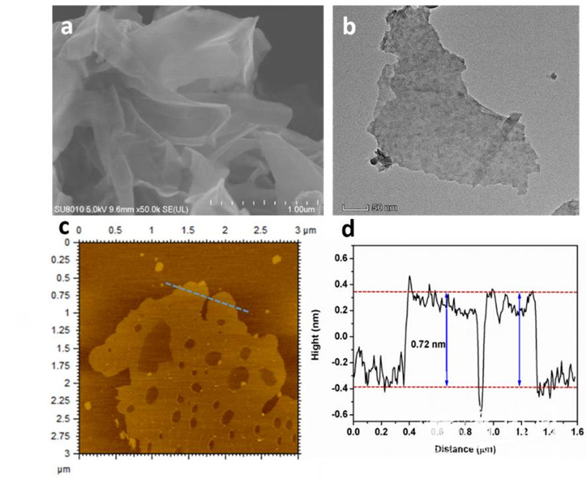 Co0.85Se樣品的SEM(a), TEM(b), AFM(c,d)圖