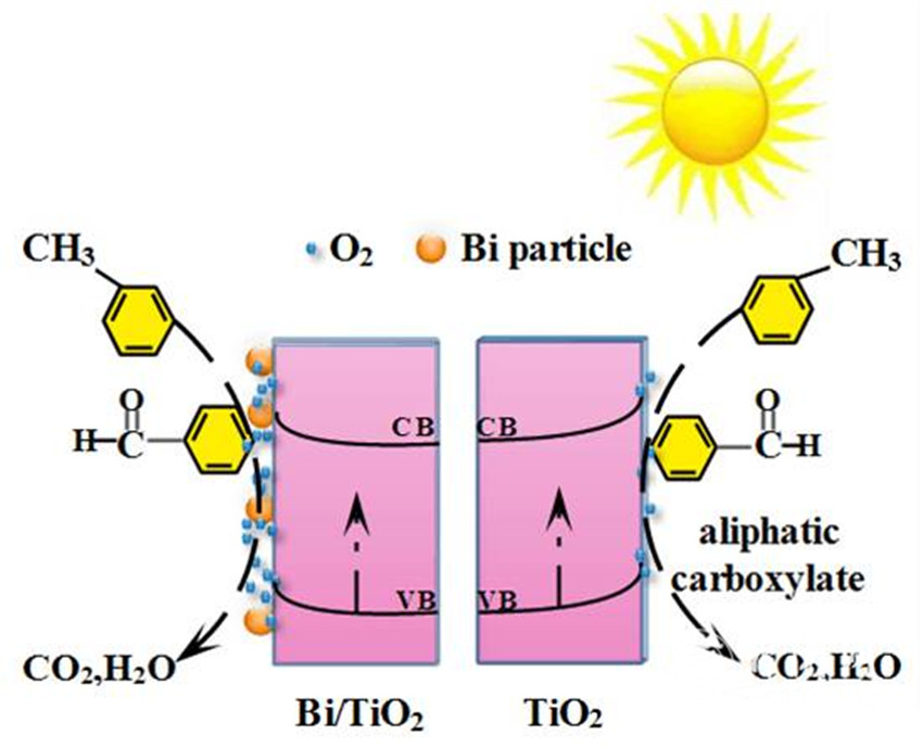 在Bi修飾TiO2和純TiO2表面上,甲苯降解可能的微觀過程