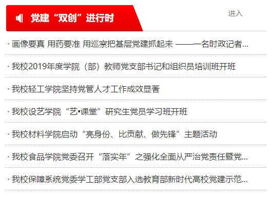 去年12月,我校在教育部和省教工委新時(shí)代高校黨建示范創(chuàng)建和質(zhì)量創(chuàng)優(yōu)工作中斬獲佳績。今年4月,經(jīng)資格審查、專家評(píng)審,學(xué)校黨委研究決定,將輕工科學(xué)與工程學(xué)院黨委等5個(gè)分黨委作為學(xué)校黨建工作標(biāo)桿學(xué)院,將機(jī)關(guān)黨委黨辦校辦黨支部等42個(gè)黨支部作為學(xué)校黨建工作樣板支部,以2019年4月至2020年5月為培育創(chuàng)建期,進(jìn)一步推進(jìn)我校黨建“雙創(chuàng)”工作建設(shè)。為全方位助力學(xué)校黨建“雙創(chuàng)”工作的開展,本學(xué)期以來,宣傳部陸續(xù)在校園網(wǎng)主頁開辟了【黨建“雙創(chuàng)”進(jìn)行時(shí)】專欄、新時(shí)代高校黨建“雙創(chuàng)”工作專題網(wǎng)站,有力推進(jìn)樣板支部立項(xiàng)建設(shè)、共同實(shí)現(xiàn)學(xué)?;鶎狱h建工作的向前發(fā)展。接下來,宣傳部將在現(xiàn)有工作基礎(chǔ)上,充分運(yùn)用新時(shí)代高校黨建“雙創(chuàng)”工作專題網(wǎng)站,按照學(xué)校黨委總要求,以推動(dòng)學(xué)校事業(yè)發(fā)展為落腳點(diǎn),扎實(shí)開展黨建“雙創(chuàng)”宣傳引領(lǐng)工作,不斷深化拓展載體功能,及時(shí)發(fā)掘、凝煉、宣傳校內(nèi)各黨組織的探索經(jīng)驗(yàn)、培育成果、創(chuàng)建成效,有計(jì)劃有步驟地把點(diǎn)上的經(jīng)驗(yàn)做法推廣到面上去,煥發(fā)基層黨組織建設(shè)活力。也廣泛歡迎全校各級(jí)黨支部踴躍投稿、對(duì)標(biāo)爭先,積極展現(xiàn)本支部風(fēng)采,相互借鑒交流創(chuàng)建成果經(jīng)驗(yàn),群策群力推動(dòng)學(xué)校各級(jí)黨組織全面進(jìn)步全面過硬,推動(dòng)學(xué)校黨建質(zhì)量全面創(chuàng)優(yōu)全面提升。