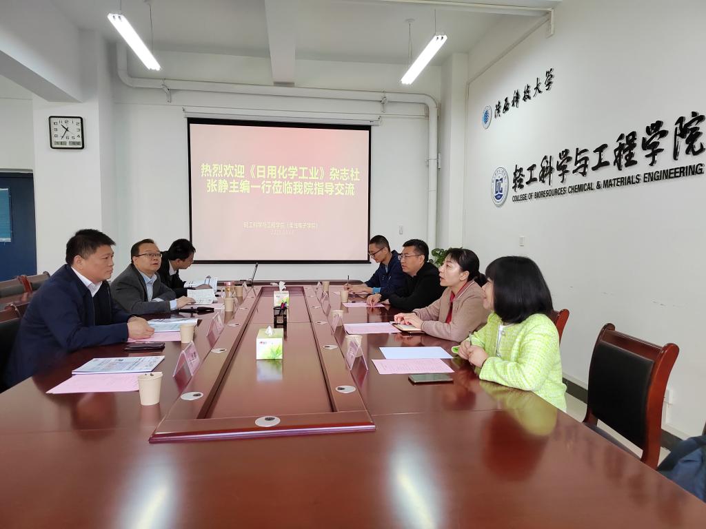會上,呂斌對張靜一行來訪表示歡迎,并對輕工學(xué)院的學(xué)科建設(shè)、人才培養(yǎng)和科學(xué)研究等情況做了介紹。劉國棟詳細介紹了輕工學(xué)院教學(xué)、科研、學(xué)科和專業(yè)等基本情況。隨后,張靜介紹了《日用化學(xué)工業(yè)》雜志社的基本情況。