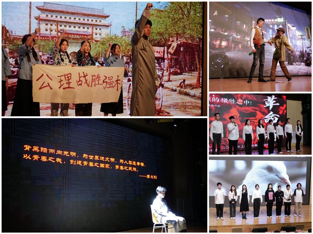 在宣誓儀式的紅色文藝展演環(huán)節(jié),藝播專業(yè)本科生黨支部、朗誦主持隊表演了配音作品《傳承先烈遺志,共筑強國盛世》《她》,院學(xué)生會話劇隊、“藝心向黨”工作室自編自演了話劇《革命者》,同學(xué)們結(jié)合自己的專業(yè)特長表達(dá)了對革命先烈的崇高敬意。