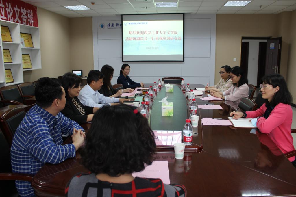6月2日下午,西安工業(yè)大學(xué)文學(xué)院院長吳妍妍、新生院副院長張華、MTI中心主任雷華、英語專業(yè)教研室主任張靜華一行五人來我校文理學(xué)院開展外語教學(xué)調(diào)研工作。文理學(xué)院院長劉建科、副院長李穩(wěn)敏、外語系主任李俊葉和外語系教師代表出席座談會。座談會由李穩(wěn)敏主持。
