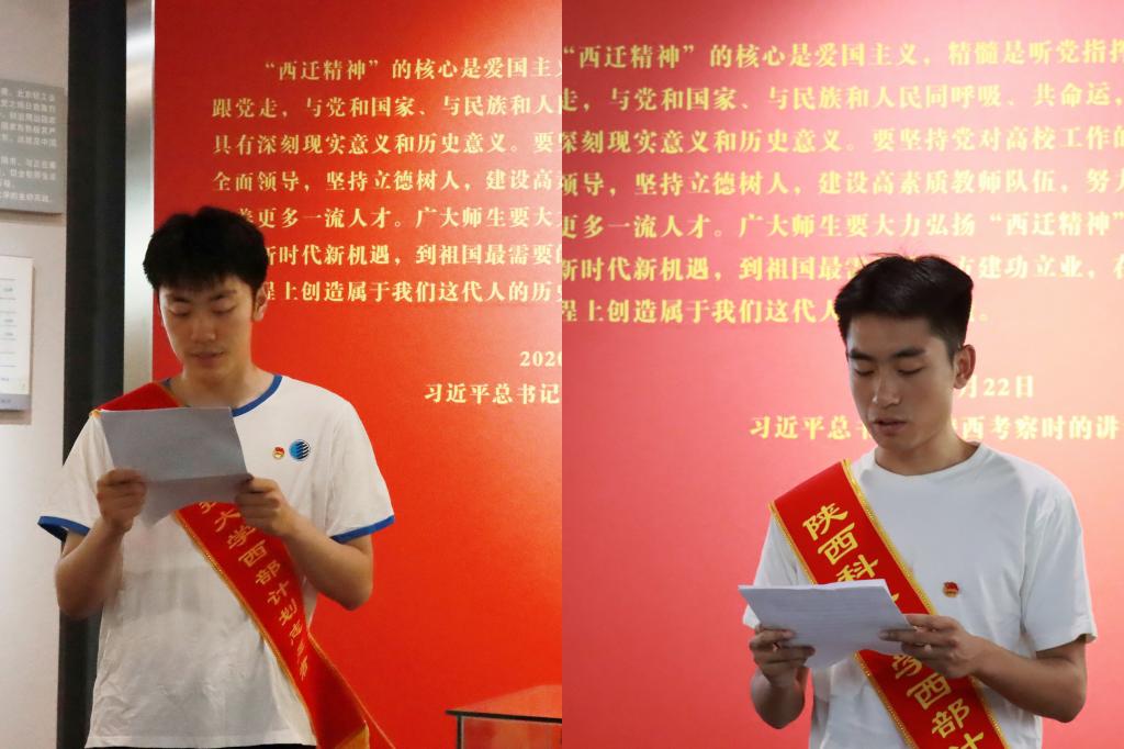 研究生支教團代表張云飛及西部計劃志愿者代表孫凡哲分享了自己參與西部計劃的初心并對未來工作做出表態(tài)。