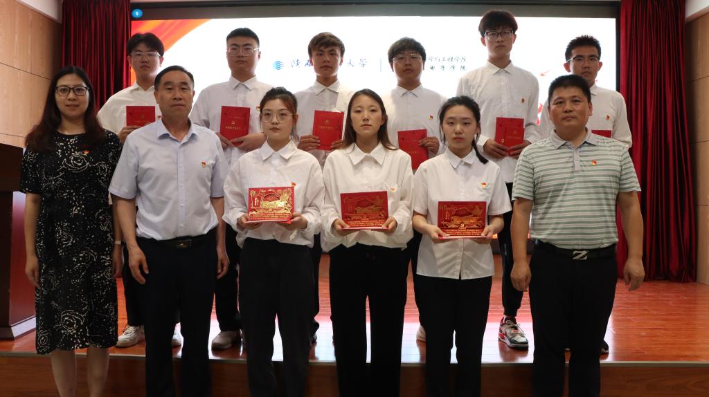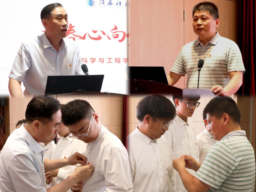 輕工學院黨委書記李新平、院長呂斌、學院黨委委員張曼共同為預備黨員佩戴黨員徽章并贈予《中國共產黨章程》和政治生日卡,希望他們快速轉變政治身份,做好先進表率。