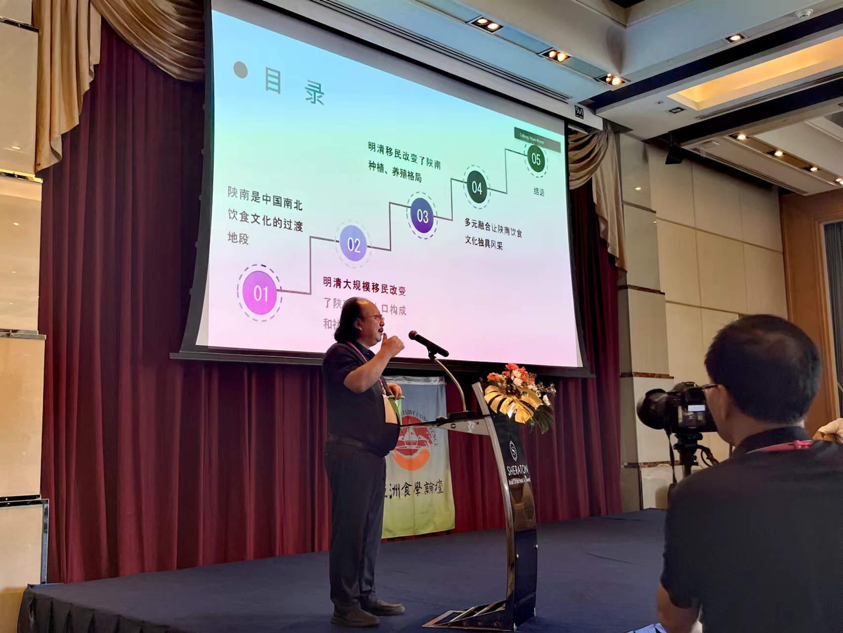田龍過教授因參與大型紀錄片《千年陜菜》(總撰稿)而涉足飲食文化領域,多次受邀在咸陽國際面食之都建設高峰論壇、西安國際美食博覽會、西安國際美食之都建設論壇等做主旨發(fā)言。作為本次會議分論壇“華人餐桌上的傳統(tǒng)與融合”的特邀主講嘉賓,田教授做了題為《明清移民與陜南飲食文化的歷史變遷》的主旨演講。他介紹了陜西在中國飲食文化中的地位,認為陜北是游牧飲食文化和農耕飲食文化的交匯處,是民族飲食融合文化的典型地帶。關中是中華文明的發(fā)祥地,是中國飲食文化根文化所在地。陜南是中國南北地理氣候的分界線,是黃河文明和長江文明、麥作文化和稻作文化的交匯處,也是移民飲食文化的樣本區(qū)域。陜西這三大飲食文化板塊代表了中國飲食文化發(fā)展變遷的不同進程和不同維度,是研究中國飲食文化最值得關注的核心地區(qū)。隨后,他就明清以來陜南移民對民風、民俗和種植業(yè)、養(yǎng)殖業(yè)的影響以及飲食文化的演變進行了詳細闡述。