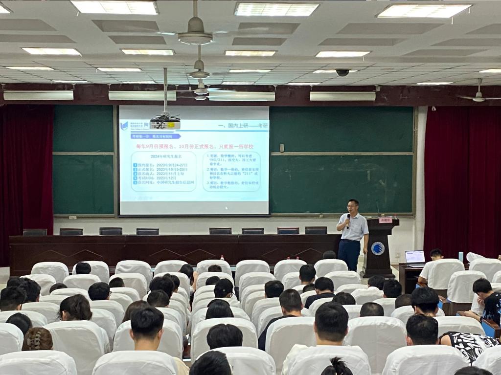 薛朝華首先介紹了當(dāng)前大背景下的就業(yè)形勢(shì)和學(xué)院首屆畢業(yè)生的就業(yè)情況。接著,分別就國(guó)內(nèi)考研、國(guó)外申研、就業(yè)展開(kāi)分析,結(jié)合2023屆畢業(yè)生案例,在考研要點(diǎn)、申研文書(shū)寫(xiě)作、簡(jiǎn)歷制作等方面為同學(xué)們提供了切實(shí)可行的建議。他希望,學(xué)生要統(tǒng)籌好大四階段課程學(xué)習(xí)及個(gè)人發(fā)展目標(biāo)準(zhǔn)備,做好時(shí)間管理及精力分配,并就大四階段教學(xué)管理及考核做有關(guān)強(qiáng)調(diào)說(shuō)明。他表示學(xué)院將全力支持學(xué)生升學(xué)就業(yè)工作,成為學(xué)生升學(xué)就業(yè)最堅(jiān)實(shí)的后盾。
