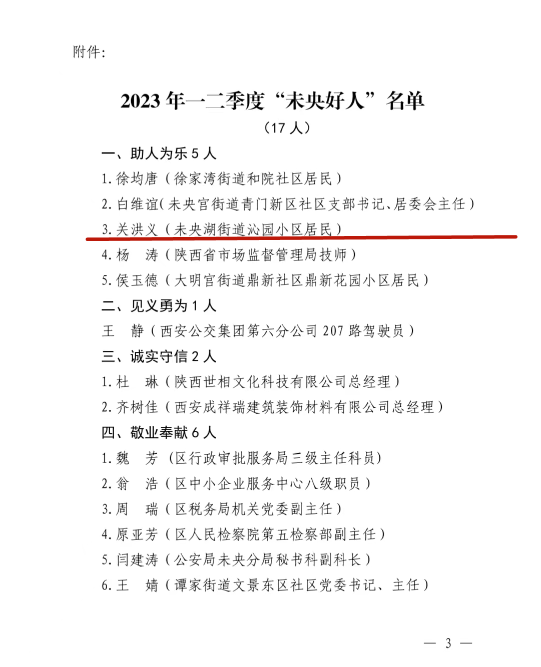 中共西安市未央?yún)^(qū)委文明辦日前下發(fā)〔2023〕16號(hào)文件《關(guān)于公布2023年一二季度“未央好人”名單的通知》,陜西科技大學(xué)沁園社區(qū)居民關(guān)洪義獲評(píng)“未央好人”榮譽(yù)稱號(hào)。