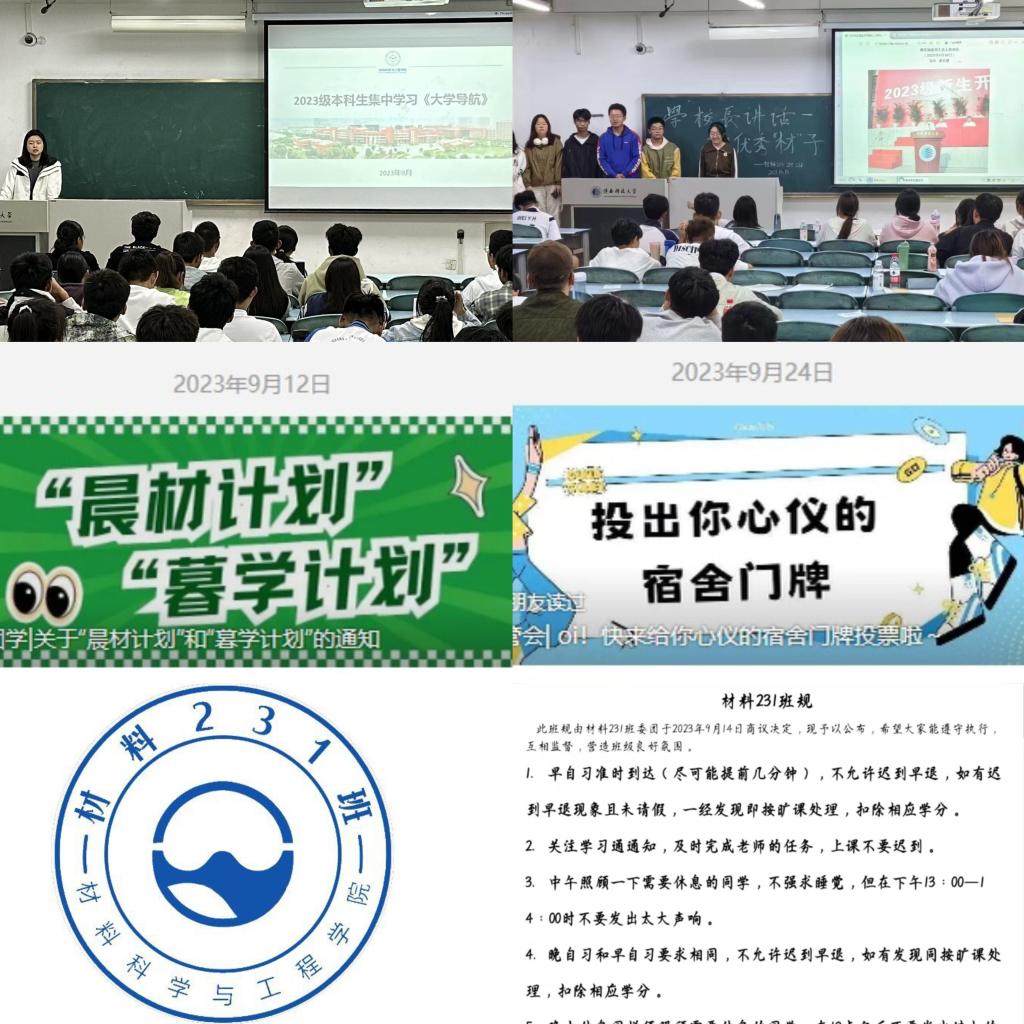 聚焦規(guī)矩意識(shí) 強(qiáng)化日常管理。通過(guò)新生入學(xué)教育大會(huì),集中學(xué)習(xí)《校長(zhǎng)李志健在2023級(jí)新生開(kāi)學(xué)典禮暨軍訓(xùn)動(dòng)員大會(huì)上的講話》《大學(xué)導(dǎo)航》《陜西科技大學(xué)章程》等教育內(nèi)容,幫助新生明確學(xué)校規(guī)章制度,培養(yǎng)新生規(guī)矩意識(shí);2023級(jí)新生自進(jìn)入正常教學(xué)周起,全員參與材料學(xué)院晨材計(jì)劃、暮學(xué)計(jì)劃,豐富校園生活,保持學(xué)習(xí)熱情,營(yíng)造了良好的學(xué)習(xí)氛圍和優(yōu)良學(xué)風(fēng);各班依照《大學(xué)導(dǎo)航》制定《班級(jí)規(guī)定》及班級(jí)標(biāo)識(shí)體系,將個(gè)人行為與集體榮譽(yù)密切集合,建立向上向好向?qū)W班風(fēng);學(xué)院自管會(huì)開(kāi)展宿舍門牌設(shè)計(jì)大賽,創(chuàng)造文明寢室環(huán)境,創(chuàng)建和諧宿舍舍風(fēng);同時(shí)針對(duì)日常管理、學(xué)籍管理、活動(dòng)參與等開(kāi)展專項(xiàng)教育,引導(dǎo)學(xué)生強(qiáng)化主體意識(shí),激發(fā)自律自省。