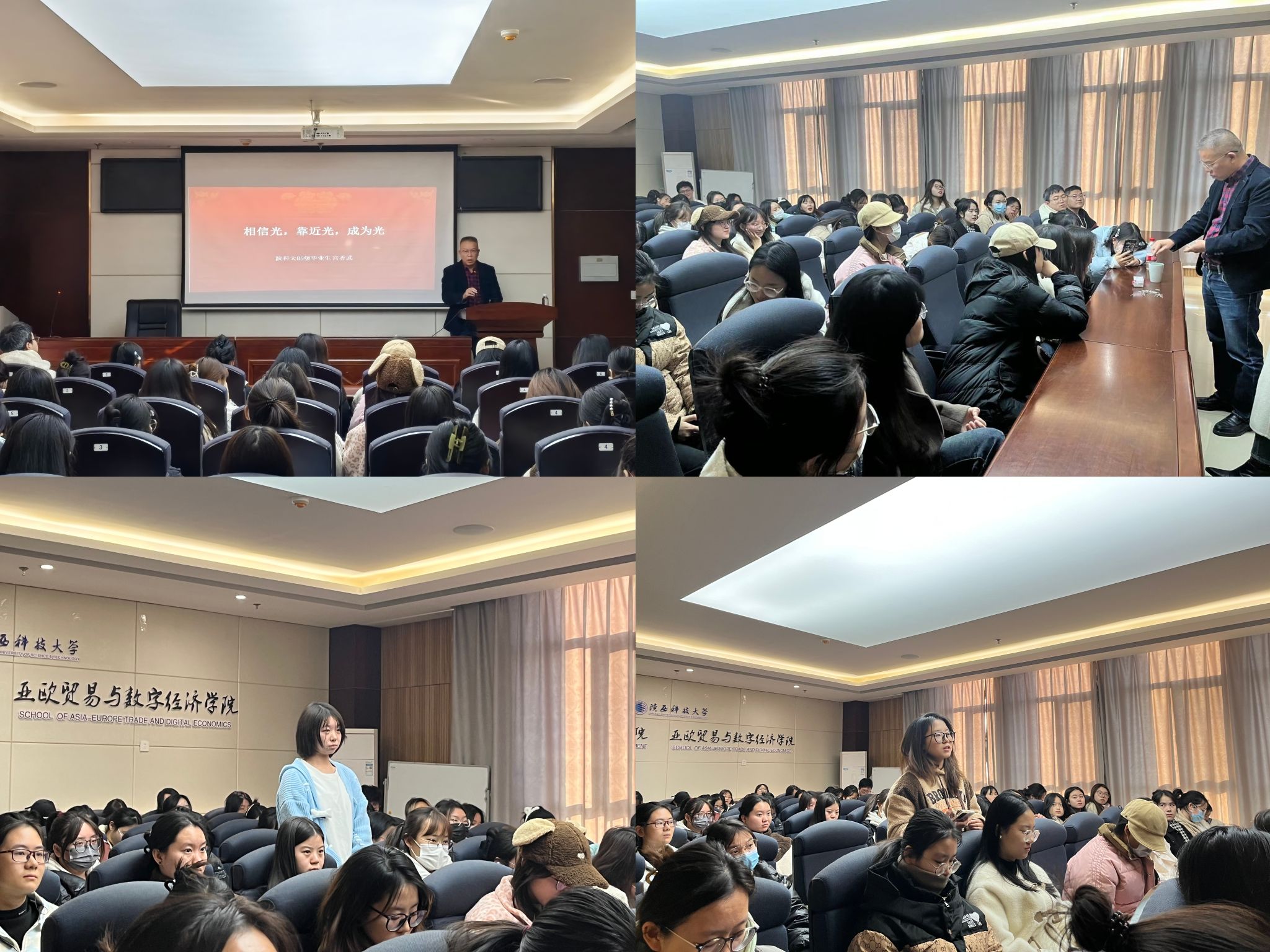 12月1日,應(yīng)校友辦和經(jīng)濟(jì)與管理學(xué)院(亞歐貿(mào)易與數(shù)字經(jīng)濟(jì)學(xué)院)邀請,我校深圳校友會(huì)執(zhí)行會(huì)長宮香武(包裝專業(yè)85級)返校作“相信光,靠近光,成為光”主題報(bào)告。報(bào)告會(huì)由校友總會(huì)辦公室主任助理張景會(huì)主持,經(jīng)管學(xué)院黨委書記崔楠及部分本科生代表參加報(bào)告。