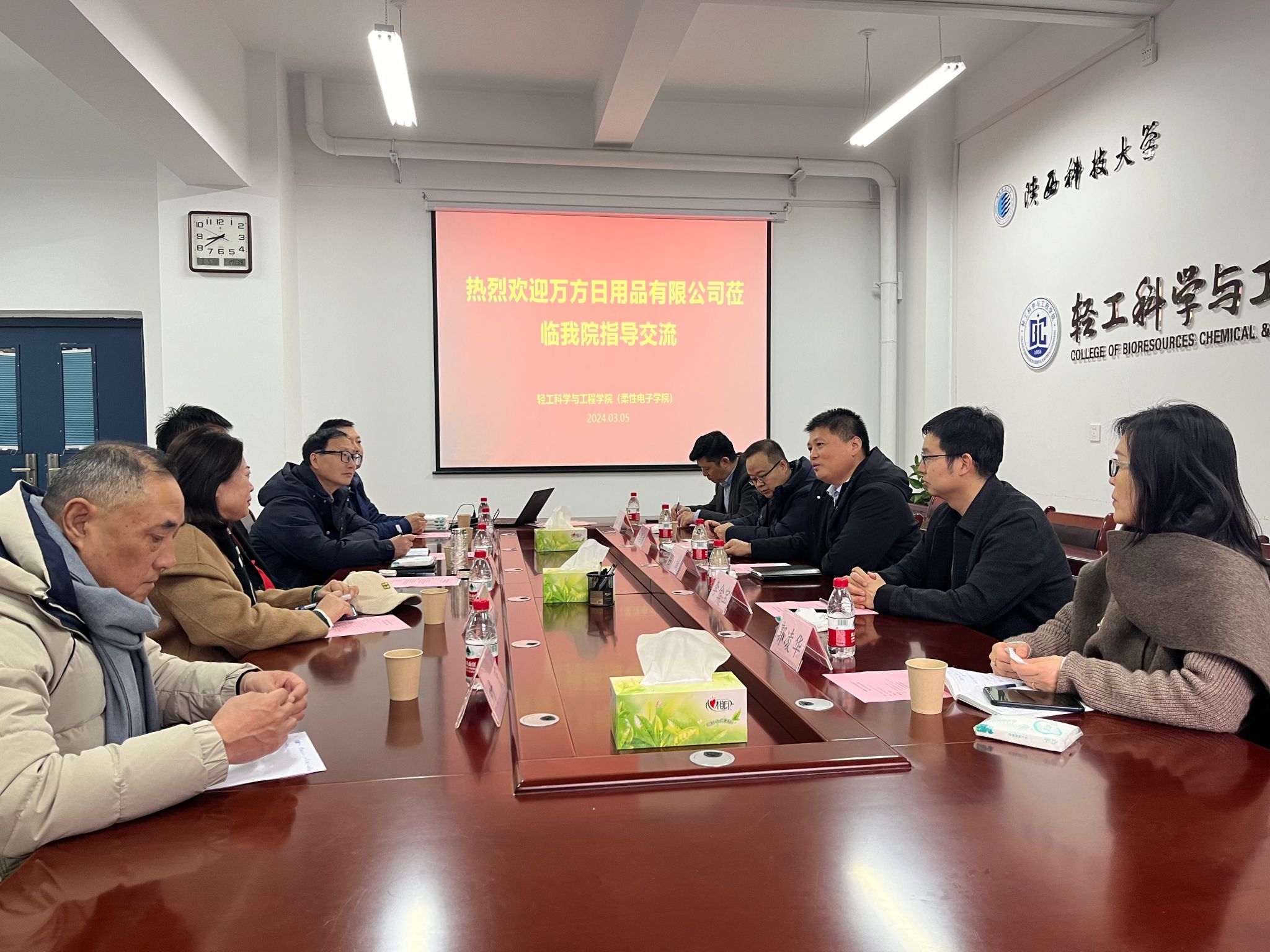 3月5日,旌德縣萬方日用品有限公司總經(jīng)理楊濤一行五人赴輕工科學與工程學院(柔性電子學院)開展合作交流。輕工學院、??萍继幭嚓P(guān)教師參加交流座談活動。