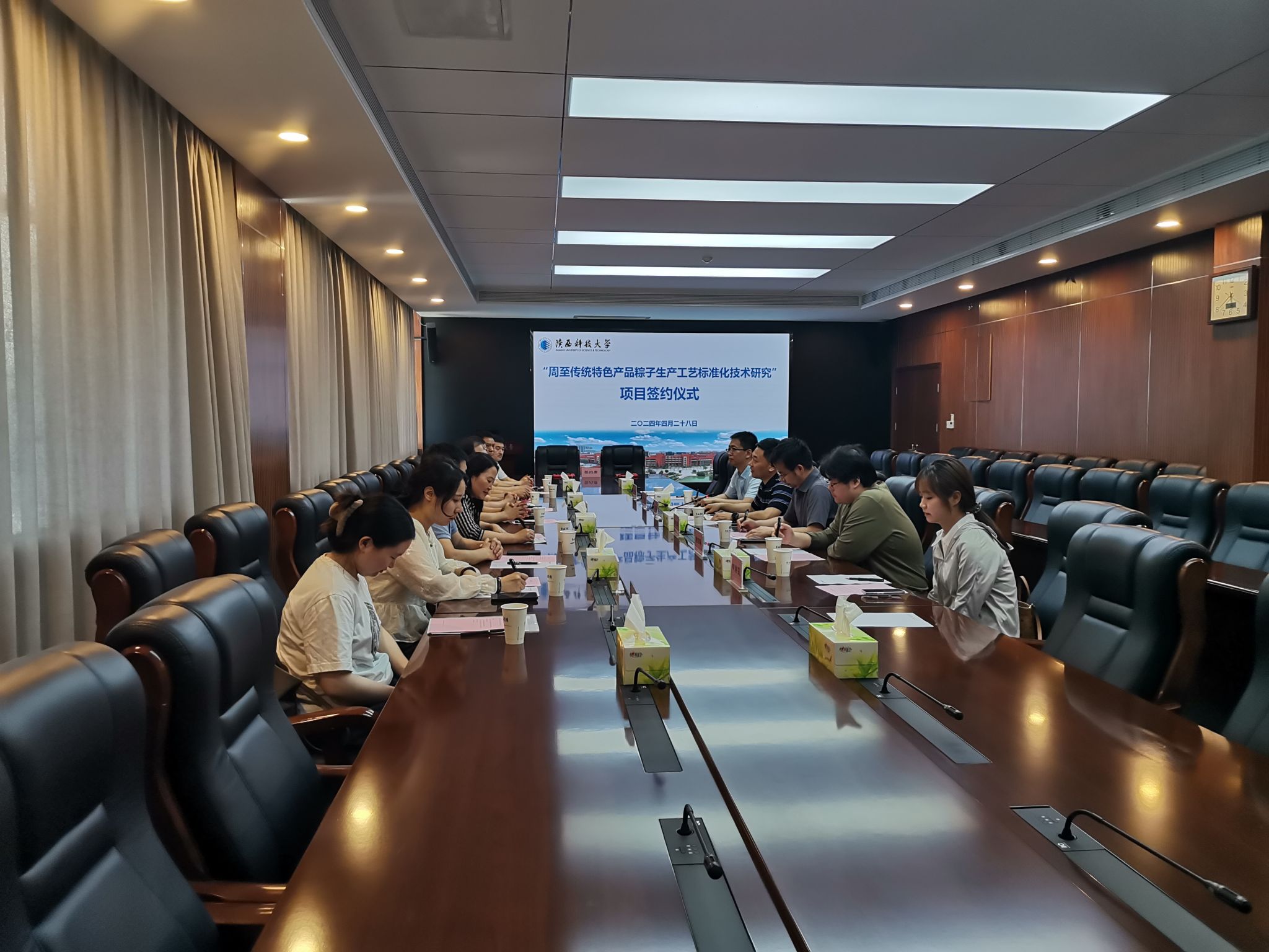 經(jīng)我校周至技術(shù)轉(zhuǎn)移中心多次牽線搭橋,4月29日下午,周至傳統(tǒng)特色產(chǎn)品粽子生產(chǎn)工藝標(biāo)準(zhǔn)化技術(shù)研究項目簽約儀式在我校506會議室舉行。周至縣司竹鎮(zhèn)黨委書記謝宏亮、人大主席魏凱、紀(jì)委書記董化利、陜西思至味食品有限公司董事長宋雷等一行10人參加簽約活動。我校前沿科學(xué)與技術(shù)轉(zhuǎn)移研究院副院長張鵬偉、食品科學(xué)與工程學(xué)院李彥軍及前沿院相關(guān)科室負(fù)責(zé)人參加了本次簽約儀式。