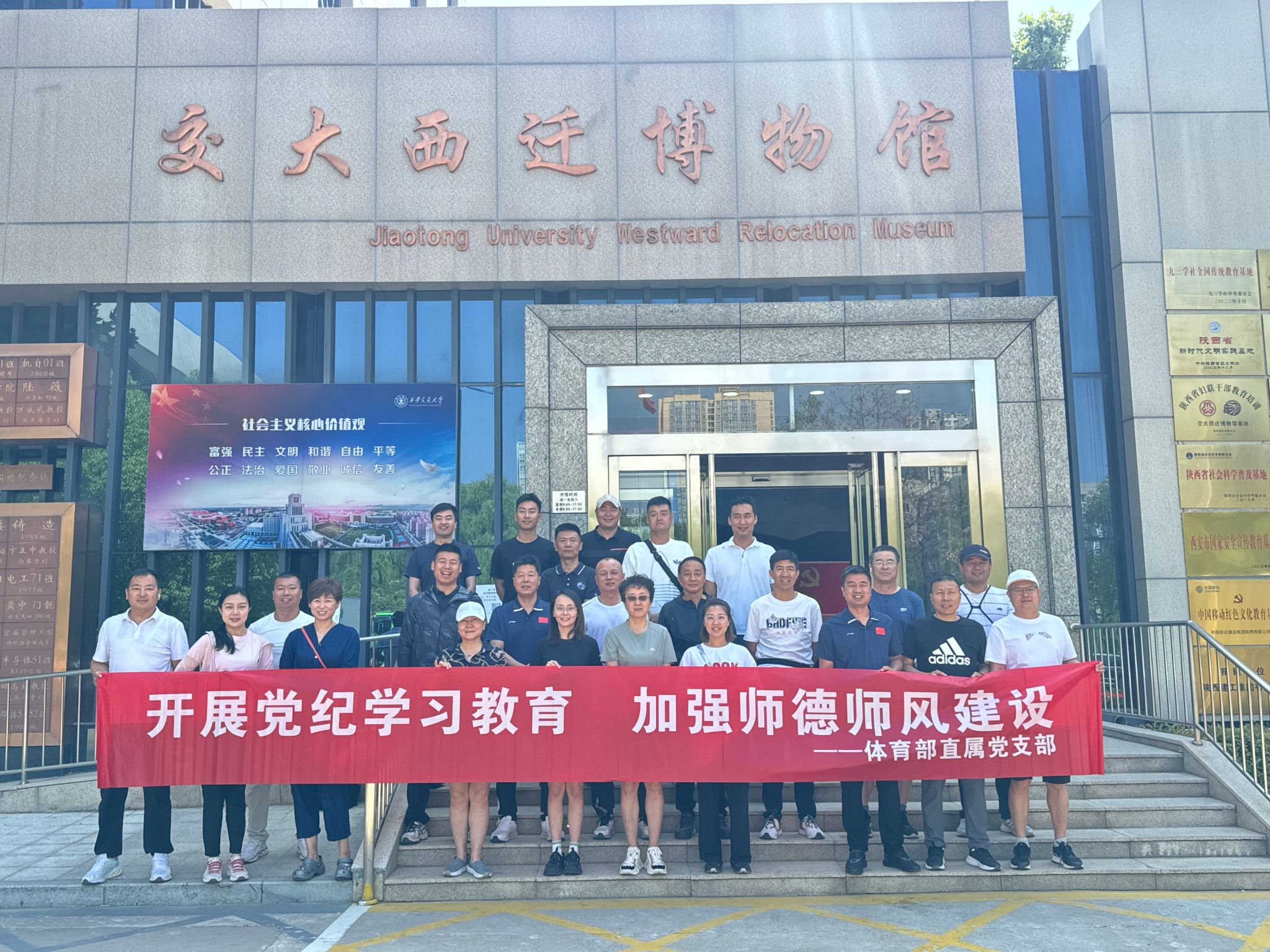 賡續(xù)西遷精神,寓紀于師培育優(yōu)良師德師風(fēng)。堅持抓黨紀條例學(xué)習(xí)與抓教師隊伍建設(shè)、強紀律意識與強師德師風(fēng)統(tǒng)籌推進,寓紀于師,切實把黨紀學(xué)習(xí)教育成果轉(zhuǎn)化為體育教師隊伍建設(shè)成效。近日,體育部直屬黨支部組織全體教師赴西安交通大學(xué)西遷博物館舉行了“開展黨紀學(xué)習(xí)教育,加強師德師風(fēng)建設(shè)”實踐研學(xué)。通過實踐參觀,進一步激發(fā)了體育教師,作為西遷高校教師群體的自豪感和使命感。大家表示要牢記習(xí)近平總書記諄諄教誨,準(zhǔn)確把握“西遷精神”的核心要義和精髓內(nèi)涵,大力弘揚和傳承我?!叭齽?chuàng)兩遷”大學(xué)精神,努力工作、擔(dān)當(dāng)作為,為促進學(xué)校體育事業(yè)發(fā)展,服務(wù)學(xué)生健康成長貢獻體育人的力量。