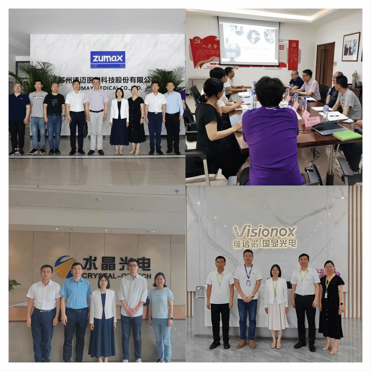 陳源梅一行先后走訪了浙江水晶光電科技股份有限公司、蘇州速邁醫(yī)學(xué)科技股份有限公司、昆山國顯光電有限公司、昆山龍騰光電股份有限公司。走訪中,院企雙方進(jìn)行了深度座談交流,聽取各家企業(yè)對(duì)學(xué)院人才培養(yǎng)、專業(yè)建設(shè)方面的意見和建議,了解企業(yè)用人需求,邀請(qǐng)企業(yè)更多參與到教學(xué)科研、產(chǎn)教融合、人才培養(yǎng)等過程中,共同推進(jìn)院企合作共贏,并就近期招聘事宜達(dá)成合作意向。調(diào)研過程中,陳源梅一行還參觀了企業(yè)展廳和生產(chǎn)車間,深入了解企業(yè)的發(fā)展進(jìn)程,并看望了在企工作的部分校友,詳細(xì)了解校友的發(fā)展情況,希望校友繼續(xù)關(guān)心助推學(xué)院發(fā)展。