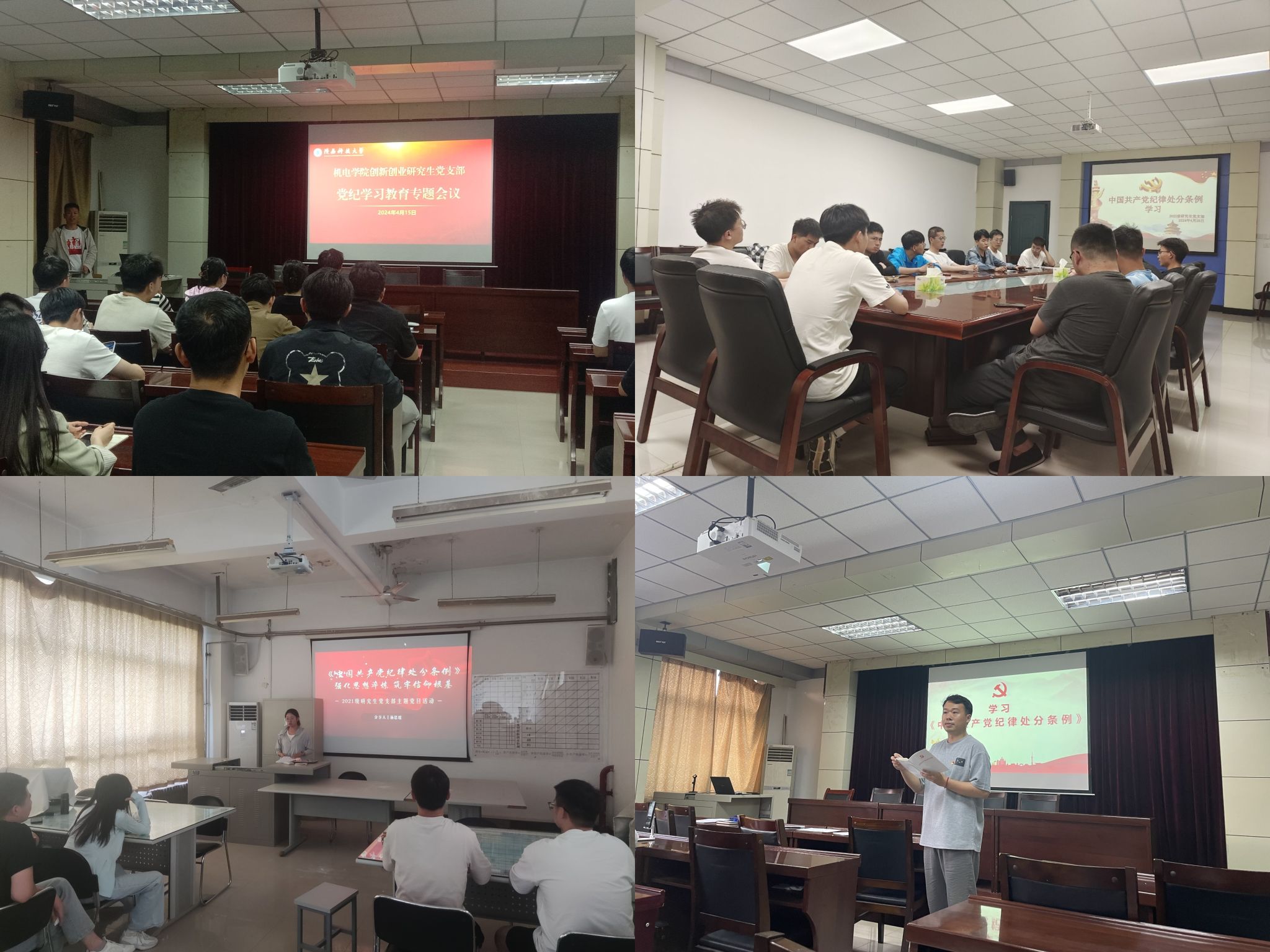 研究生黨支部通過(guò)支部書記講黨課、主題黨日活動(dòng)、集中學(xué)習(xí)等形式進(jìn)行黨風(fēng)黨紀(jì)專題學(xué)習(xí)。博士黨支部組織觀看學(xué)習(xí)《教育系統(tǒng)違紀(jì)違法典型案例警示錄》,創(chuàng)新創(chuàng)業(yè)黨支部專題研討習(xí)近平總書記關(guān)于加強(qiáng)黨的紀(jì)律教育的重要論述,2021級(jí)研究生黨支部集中學(xué)習(xí)習(xí)近平總書記重要文章《必須堅(jiān)持人民至上》,2022級(jí)研究生黨支部逐一分享《中國(guó)共產(chǎn)黨紀(jì)律處分條例》學(xué)習(xí)心得,2023級(jí)研究生黨支部組織開(kāi)展“黨紀(jì)我先知”支部大討論活動(dòng)。通過(guò)理論學(xué)習(xí),使研究生黨員真正從思想上筑起一道永不倒塌的拒腐防變的堅(jiān)固防線。