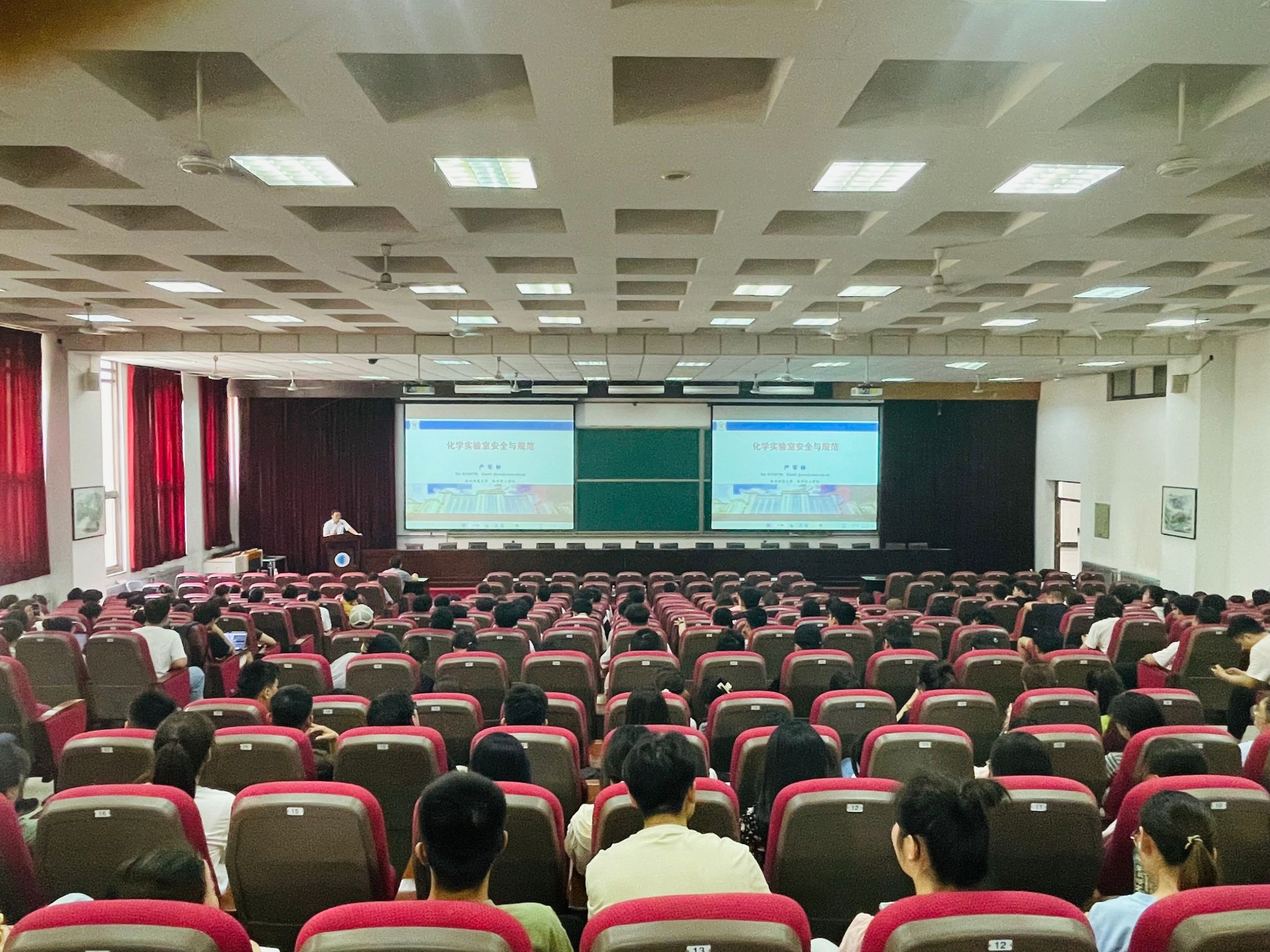 為筑牢校園安全防線,提高師生的實驗室安全意識,培養(yǎng)學(xué)生對實驗室安全事故的處置能力,有效防止實驗室安全事故的發(fā)生,6月19日下午,化學(xué)與化工學(xué)院在三號教學(xué)樓102會議室開展實驗室安全管理及實驗安全培訓(xùn)會。培訓(xùn)邀請陜西師范大學(xué)應(yīng)用表面與膠體化學(xué)教育部重點實驗室副主任、化學(xué)國家級實驗教學(xué)示范中心辦公室主任嚴(yán)軍林高級實驗師講授。學(xué)院全體教師、全體碩、博士研究生和部分本科生參加培訓(xùn),講座由化工學(xué)院院長助理王偉濤主持,培訓(xùn)會分兩階段進行。