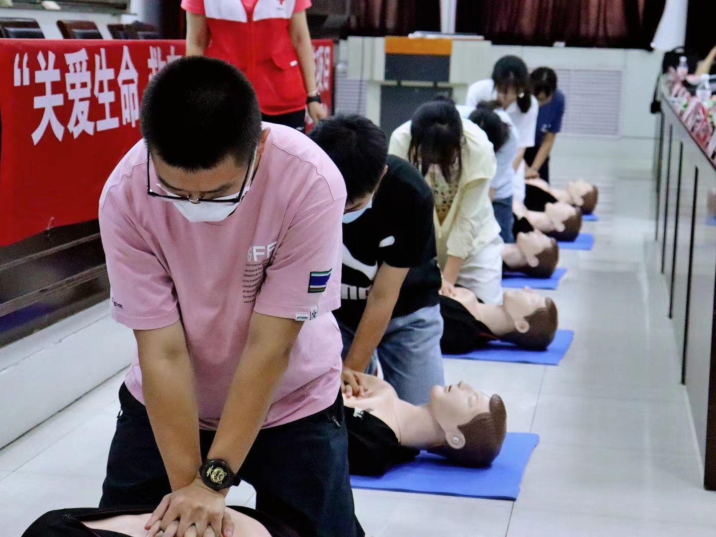 為進(jìn)一步增強(qiáng)學(xué)生的安全意識(shí),提升學(xué)生的應(yīng)急救護(hù)技能水平,切實(shí)保障學(xué)生生命健康,6月23日下午,我校在教三101舉辦了“關(guān)愛生命 ‘救’在身邊”應(yīng)急救護(hù)培訓(xùn)活動(dòng)。陜西省紅十字應(yīng)急救護(hù)培訓(xùn)師史曄靈、苗蕾、胡紅、張歡、權(quán)政分別擔(dān)任本次培訓(xùn)的主講和訓(xùn)練師,我校王正宏、杭建等8名教師考取了陜西省紅十字應(yīng)急救護(hù)培訓(xùn)師資并擔(dān)任本次培訓(xùn)的實(shí)習(xí)助教,來自各學(xué)院的300師生參加心肺復(fù)蘇(CPR+AED)培訓(xùn)。