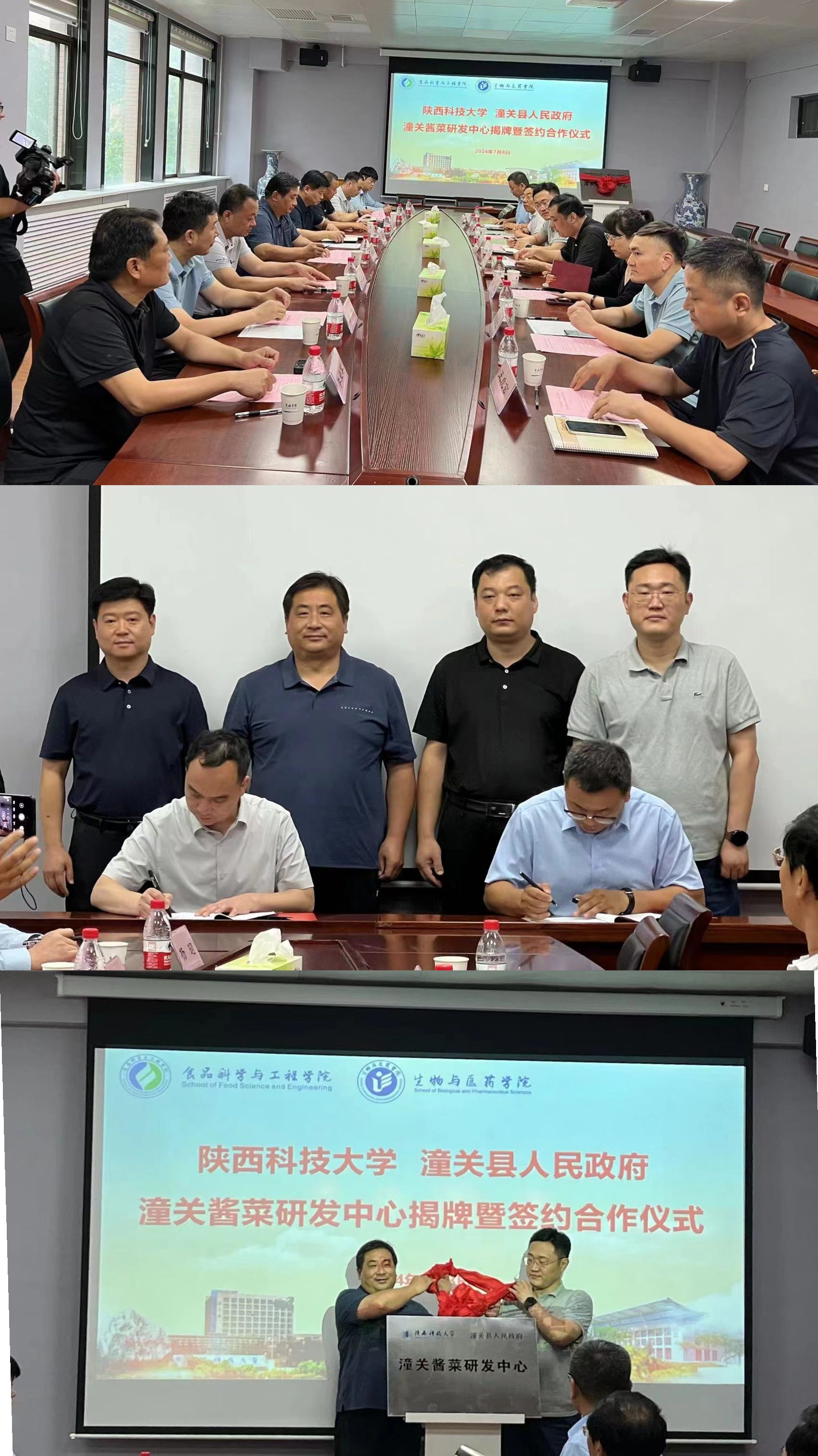 食品學(xué)院常大偉副教授作為“潼關(guān)醬菜加工生產(chǎn)線建設(shè)及產(chǎn)品研發(fā)”項目負(fù)責(zé)人,與潼關(guān)縣商業(yè)發(fā)展服務(wù)中心主任蘇寧超簽訂了合作協(xié)議,李建軍與李國梁共同為潼關(guān)醬菜研發(fā)中心揭牌。