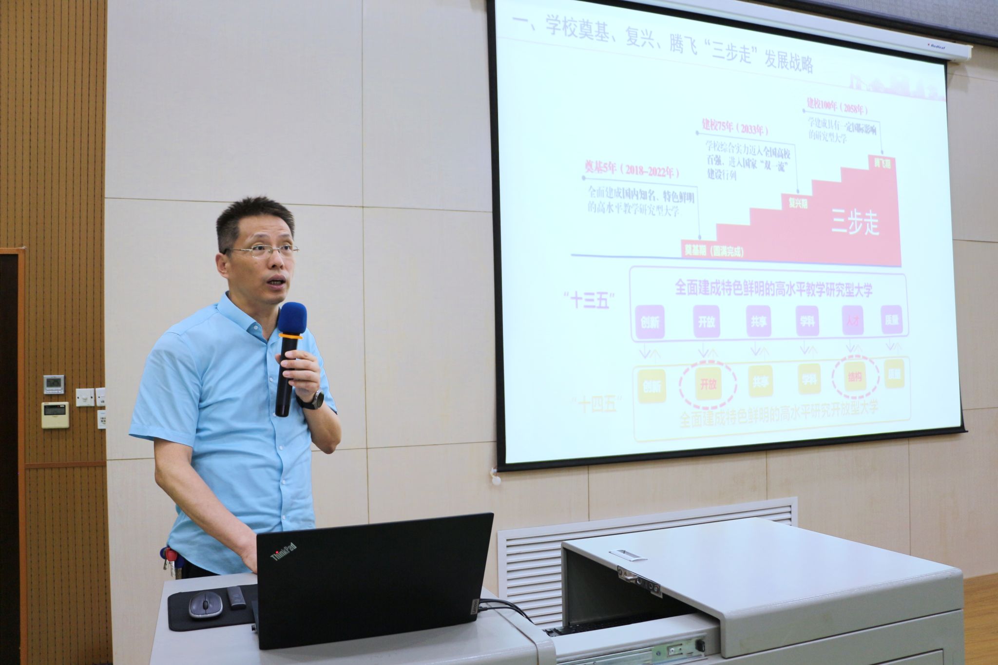 徐永建作《師資隊(duì)伍培養(yǎng)賦能學(xué)校高質(zhì)量發(fā)展》開(kāi)班動(dòng)員講話(huà),結(jié)合新時(shí)期黨和國(guó)家對(duì)教育的戰(zhàn)略定位,從學(xué)校“三步走”發(fā)展規(guī)劃,學(xué)科規(guī)劃布局,師資隊(duì)伍及人才培養(yǎng)、學(xué)校當(dāng)前改革面臨的形勢(shì)與挑戰(zhàn)等方面展開(kāi),詳細(xì)介紹了以至誠(chéng)計(jì)劃、至博計(jì)劃、卓越計(jì)劃為主要框架的教師培育體系,并對(duì)新進(jìn)教師成長(zhǎng)路徑分享了自己的思考與體會(huì)。他希望青年教師深刻認(rèn)識(shí)新時(shí)代賦予科大人的責(zé)任,懷揣“躬耕教壇,強(qiáng)國(guó)有我”的使命擔(dān)當(dāng),在最好的年華奮楫揚(yáng)帆、砥礪前行,培養(yǎng)更多的優(yōu)秀人才,以實(shí)際行動(dòng)為學(xué)校高質(zhì)量?jī)?nèi)涵式發(fā)展貢獻(xiàn)力量。