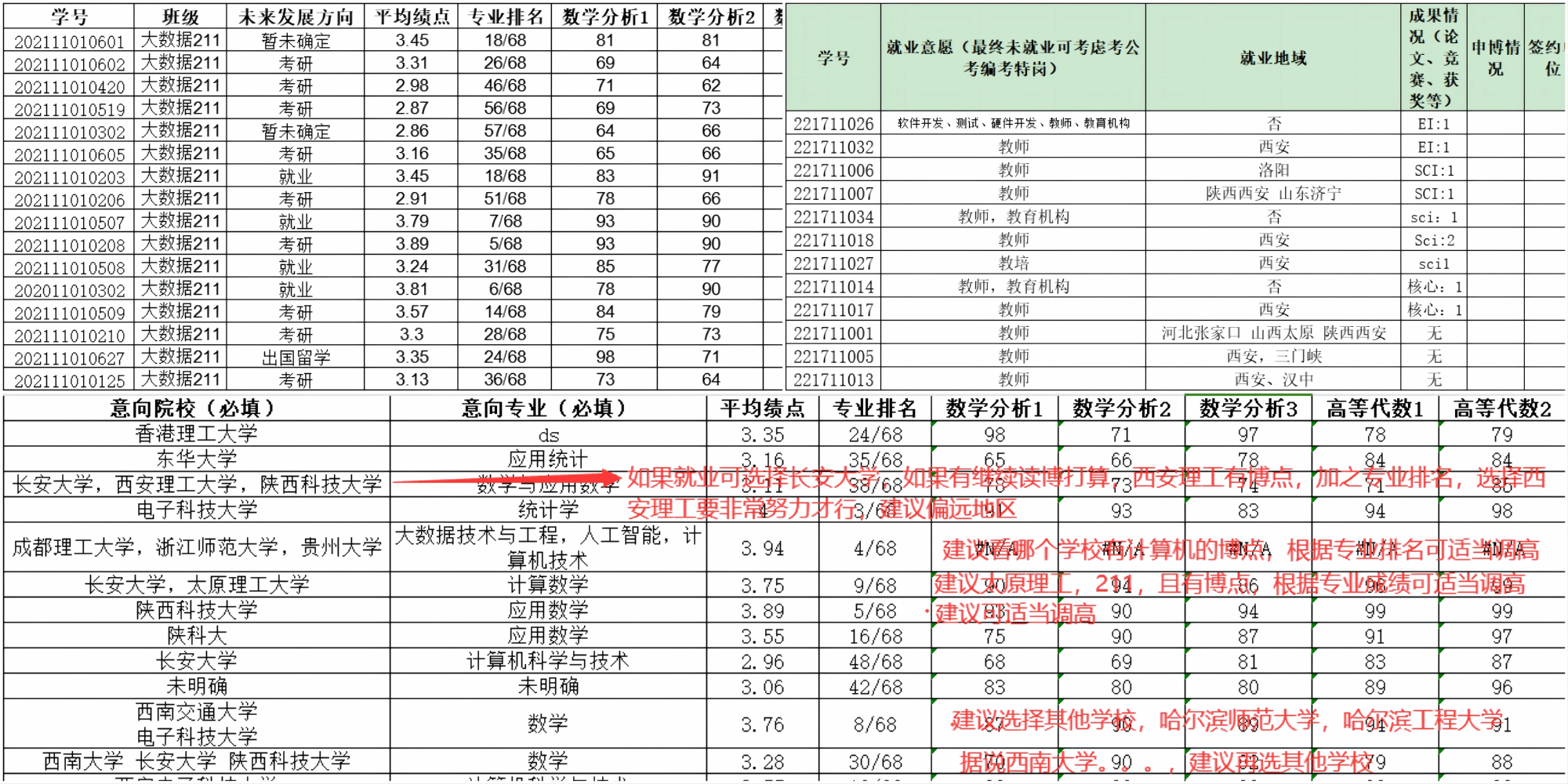為掌握2025屆學(xué)生考研就業(yè)意向,學(xué)院通過主題班會、談心談話、走訪宿舍等方式逐一摸排學(xué)生考研就業(yè)意向,建立“一生一檔”數(shù)據(jù)庫。按照“普遍指導(dǎo)、分類指導(dǎo)、個性化指導(dǎo)”相結(jié)合的方式精準(zhǔn)施策,有針對性地做好服務(wù)指導(dǎo)工作。整理21級學(xué)生的在校成績信息,完善信息庫,并根據(jù)學(xué)業(yè)成績對學(xué)生開展針對性指導(dǎo),幫助學(xué)生科學(xué)合理選擇考研就業(yè)方向,明確考研目標(biāo),做好職業(yè)規(guī)劃。收集22級研究生科研成果、榮譽獲獎等信息,建立個人求職檔案,根據(jù)個人情況開展個性化指導(dǎo)。