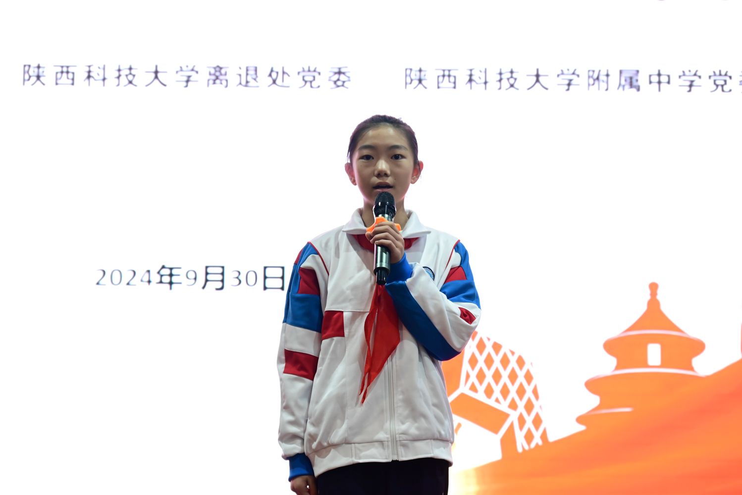 學(xué)生代表譚語桐同學(xué)領(lǐng)誦社會主義核心價值觀及陜西科技大學(xué)附屬中學(xué)校訓(xùn)、校風(fēng)及學(xué)風(fēng)。她情緒飽滿、語氣堅定,表達了對學(xué)校、對祖國的熱愛和對未來的憧憬。