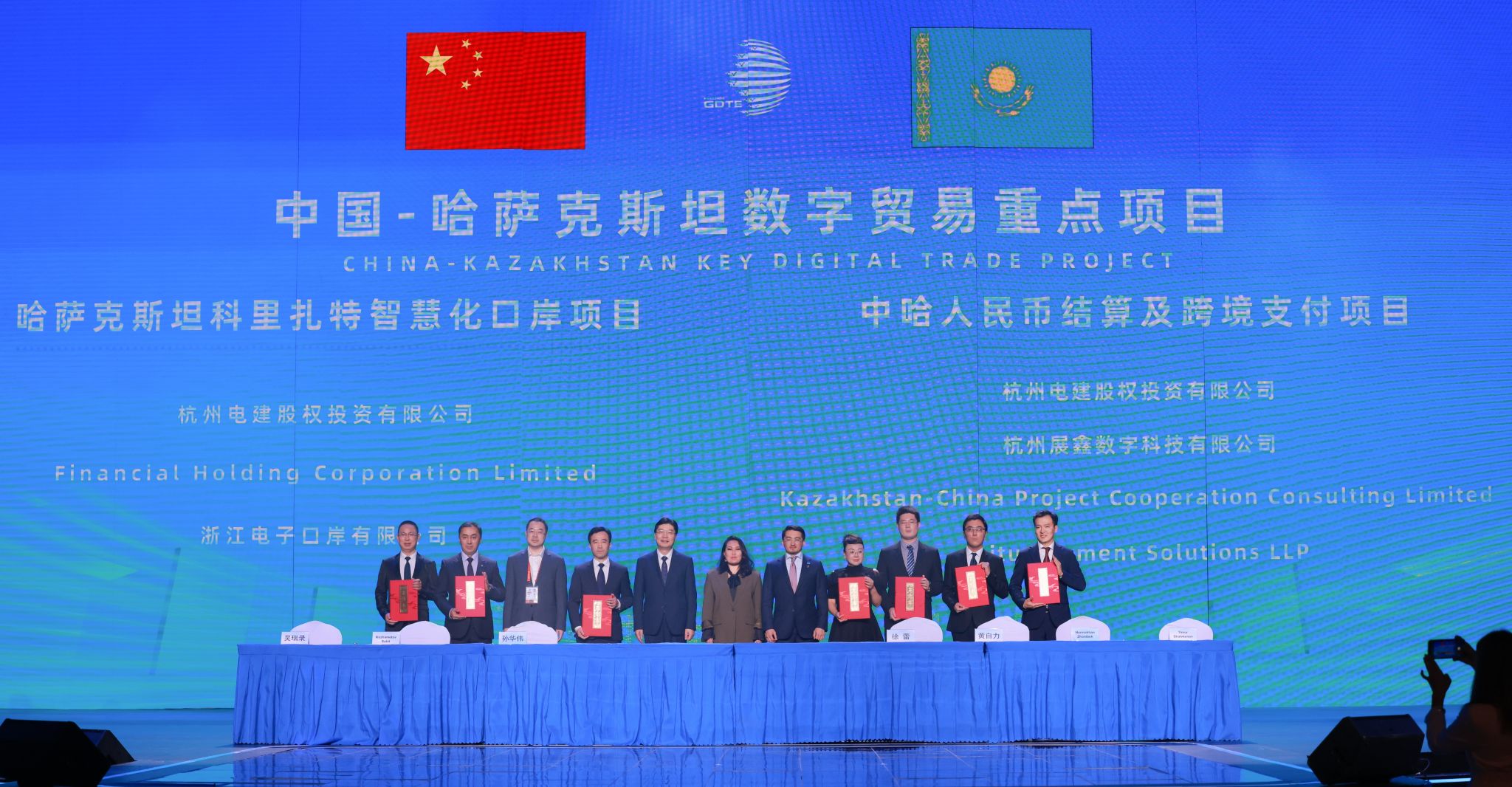 9月25日至29日,第三屆數(shù)字貿(mào)易博覽會(huì)在浙江杭州舉行。9月25日晚,中國-哈薩克斯坦數(shù)字貿(mào)易重點(diǎn)項(xiàng)目——哈薩克斯坦科里扎特智慧化口岸項(xiàng)目和中哈人民幣結(jié)算及跨境支付項(xiàng)目的簽約儀式在杭州大會(huì)展中心成功舉行。杭州電建股權(quán)投資有限公司董事長(zhǎng)吳瑞錄先生(鐘表83級(jí))、浙江電子口岸有限公司董事長(zhǎng)孫華偉先生、Financial Holding Corporation Limited董事長(zhǎng)Kozhametov Sabit先生共同簽署了科里扎特智慧化口岸項(xiàng)目。杭州電建股權(quán)投資有限公司總裁徐蕾女士、杭州展鑫數(shù)字科技有限公司代表黃自力先生及多位哈薩克斯坦方代表現(xiàn)場(chǎng)簽署了中哈人民幣結(jié)算及跨境支付項(xiàng)目。哈薩克斯坦共和國數(shù)字發(fā)展、創(chuàng)新與航空航天工業(yè)部部長(zhǎng)加斯蘭·馬迪耶夫和杭州市市長(zhǎng)姚高員共同見證了簽約儀式。此次簽約旨在推進(jìn)中哈兩國在數(shù)字、經(jīng)貿(mào)等領(lǐng)域的深度合作。