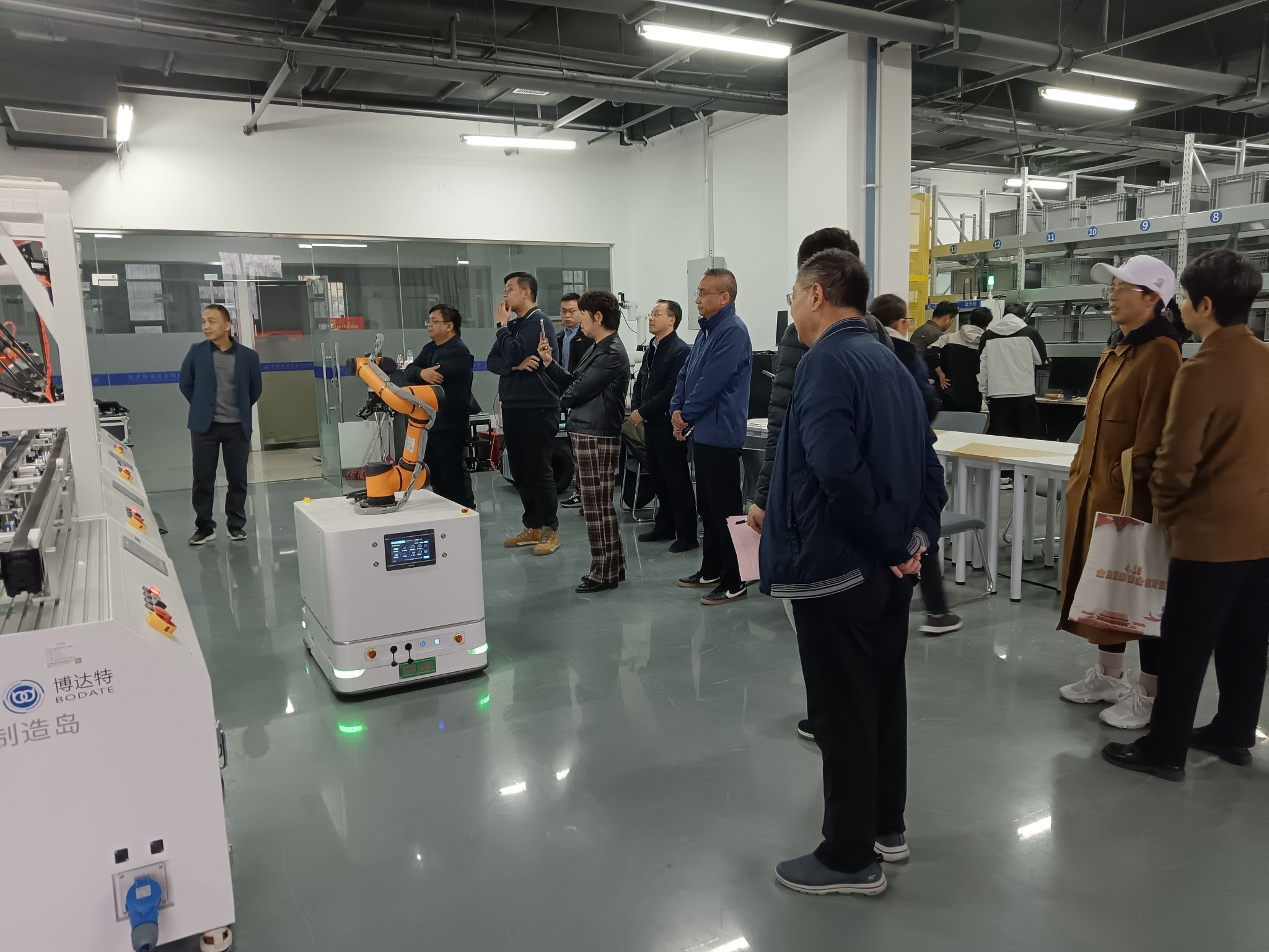 趙江民一行深入中瑞GF智能制造創(chuàng)新研究院,考察了機器人智能制造生產(chǎn)線、GF+智能制造單元,以及智能倉儲穿梭車系統(tǒng)。劉慶立老師演示了智能制造柔性生產(chǎn)線全自動化生產(chǎn)過程,柔性生產(chǎn)線由四臺機器人、五個加工單元組成,并配有MES系統(tǒng)大屏幕,展現(xiàn)了現(xiàn)代自動化生產(chǎn)的典型環(huán)節(jié)。孫建功老師講解了GF+智能制造單元的系統(tǒng)組成工作過程,該單元由地軌機器人、兩臺加工中心及綜合調(diào)度系統(tǒng)組成,能夠?qū)崿F(xiàn)航空航天行業(yè)中弧面葉輪的精確加工。孫軍艷老師講解了智能化立體倉庫穿梭車系統(tǒng),該系統(tǒng)的多個立體貨架通過智能化調(diào)度系統(tǒng),自動的向穿梭車發(fā)送控制指令,實現(xiàn)全自動化的出入庫操作。趙江民一行就智能制造系統(tǒng)中的設(shè)計、制造、維護方面的問題與相關(guān)教師進行了現(xiàn)場交流。