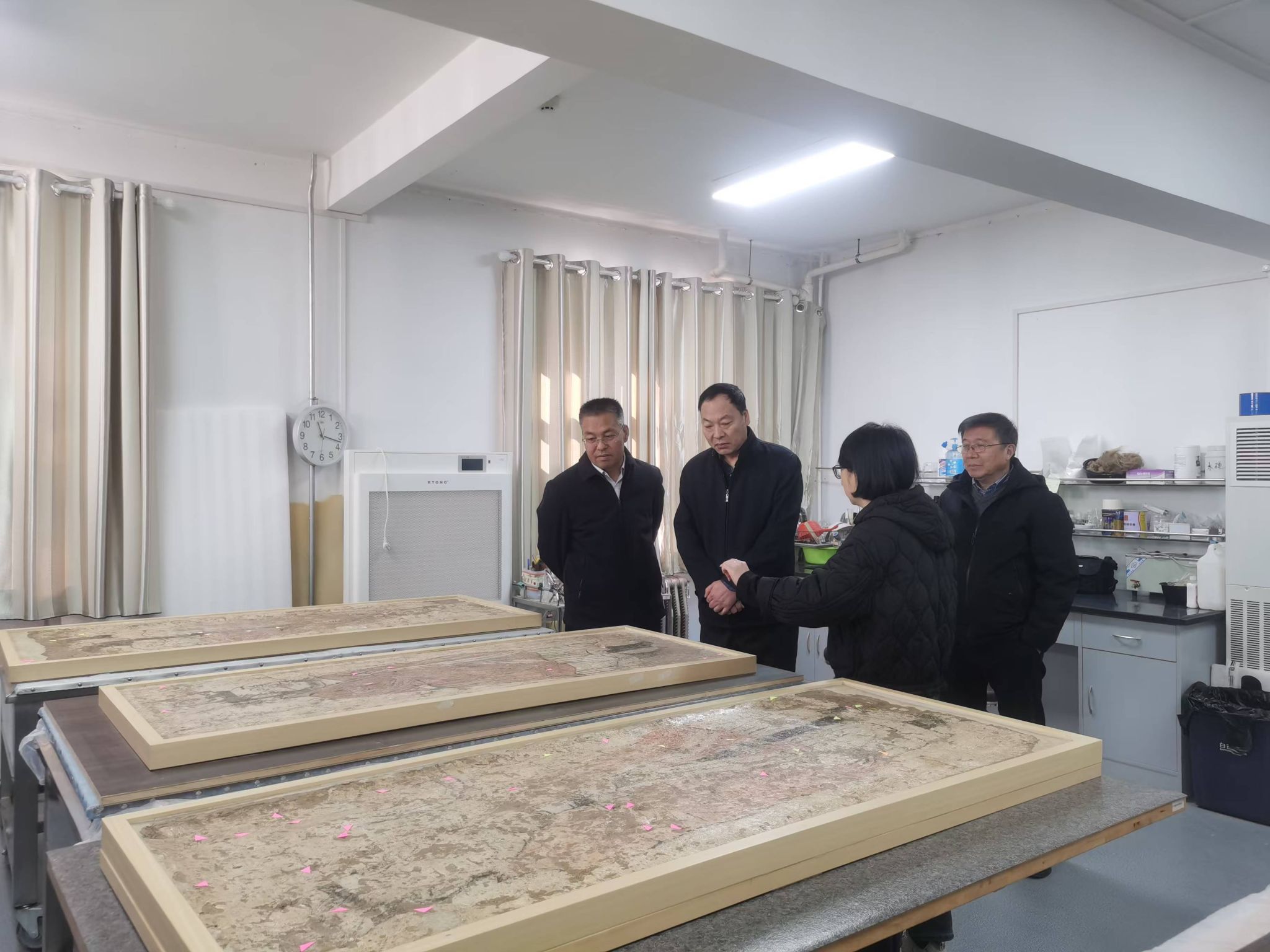 簽約儀式結(jié)束后,在張強(qiáng)、副館長武瑛的陪同下,朱建鋒一行對固原博物館壁畫及漆棺畫等珍貴文物的保存現(xiàn)狀進(jìn)行了現(xiàn)場考察,并對即將開展的合作課題進(jìn)行了進(jìn)一步的討論。本次現(xiàn)場考察交流以及合作協(xié)議的簽署,標(biāo)志著我校文物保護(hù)科學(xué)與技術(shù)學(xué)院與固原博物館實(shí)質(zhì)性合作的開始,為深化校館合作揭開了新篇章。