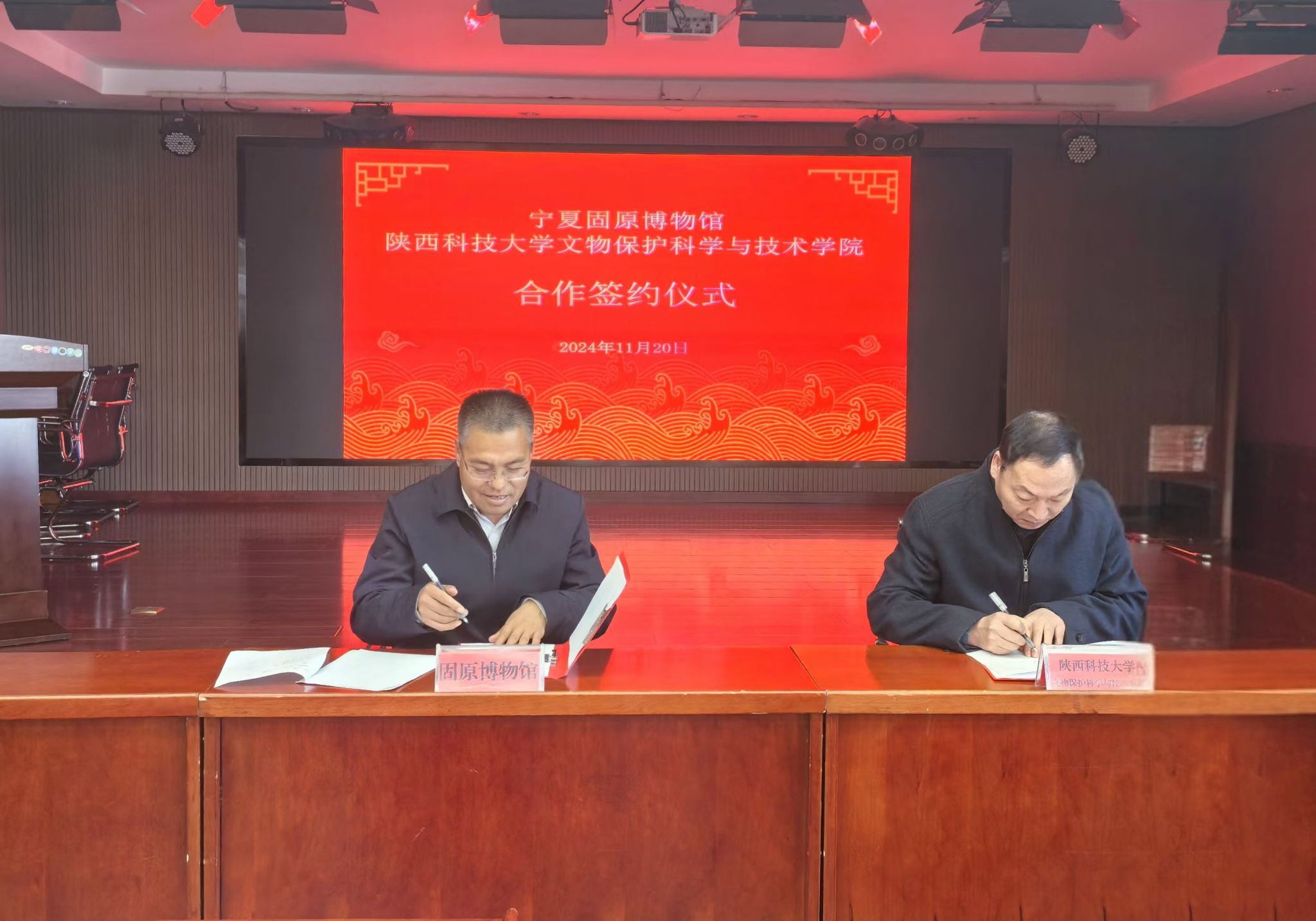 在簽約儀式上,朱建鋒首先介紹了我校的學(xué)科特色以及文物保護(hù)科學(xué)與技術(shù)學(xué)院的科研平臺、師資隊(duì)伍和研究方向等基本情況,希望以此次簽約為契機(jī),將學(xué)校的科研力量與博物館豐富的文化資源相結(jié)合,雙方能夠達(dá)成資源共享、優(yōu)勢互補(bǔ)。館長張強(qiáng)隨后介紹了固原博物館的歷史、藏品情況以及當(dāng)前在文物保護(hù)方面的研究現(xiàn)狀,希望以后雙方在文物保護(hù)、人才培養(yǎng)以及學(xué)生實(shí)踐研學(xué)等方面加強(qiáng)合作,為文化傳承與發(fā)展注入新活力。最后,朱建鋒和張強(qiáng)代表雙方簽署了《寧夏固原博物館-陜西科技大學(xué)文物保護(hù)科學(xué)與技術(shù)學(xué)院合作協(xié)議書》,同時(shí)朱建鋒聘請張強(qiáng)為我校文物保護(hù)科學(xué)與技術(shù)學(xué)院的客座教授。
