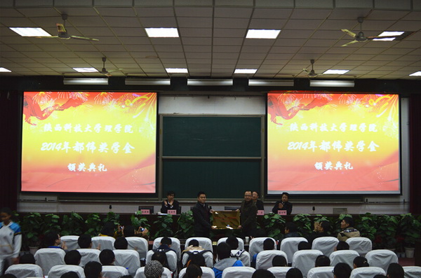 12月5日晚,理學(xué)院2014年“都偉獎(jiǎng)學(xué)金”頒獎(jiǎng)典禮在3號(hào)教學(xué)樓102教室隆重舉行。“都偉獎(jiǎng)學(xué)金”創(chuàng)立人、電子科學(xué)與技術(shù)專業(yè)98級校友、上海都偉光伏科技有限公司總經(jīng)理許期斌出席獎(jiǎng)學(xué)金頒獎(jiǎng)典禮并為學(xué)生作了題為“大學(xué)生成長與奮斗”的報(bào)告會(huì)。