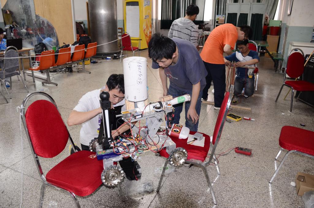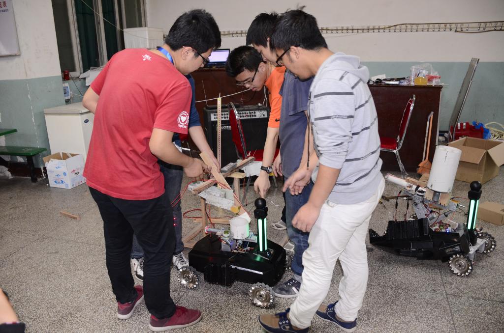 我校從2014年12月起開始大賽備戰(zhàn),由校團委牽頭組織,并配備了專門的試驗場地和活動資金,電氣與信息工程學院組織遴選,確定周強、郭文強、蔡陳赟3位指導老師帶領徐啟超、董晨宇等12名學生組成的“科大戰(zhàn)警隊”作為我校代表隊參賽。他們經(jīng)過緊張艱苦的籌備和反復試驗,設計制作的機器人戰(zhàn)隊順利通過了大賽2015年3月至5月期間進行的三輪專家考核和篩選,最終成功殺入西北賽區(qū)決賽。
